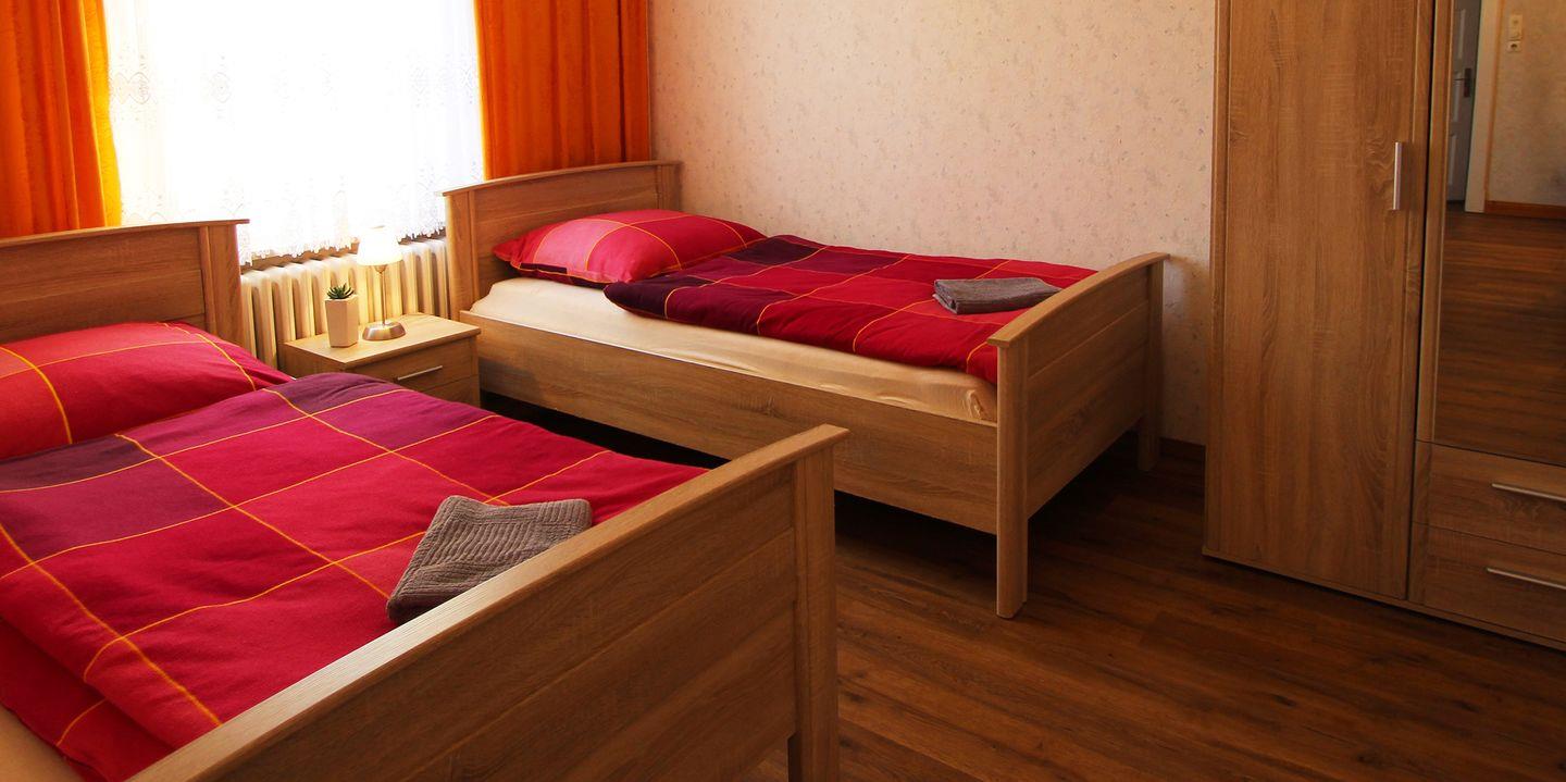 Ein 2-Zimmer Apartment, 44 m², im Erdgeschoß eines Einfamilienhauses. Es gibt ein Wohnzimmer mit Schlafsofa und einem TV, sowie ein Schlafzimmer mit 2 Einzelbetten. Eine gut ausgestattete Küchenzeile ist vorhanden. Zum Duschbad (Alleinnutzung) kommt man über den Flur, welcher außerhalb der Wohnung liegt. Hier gibt es eine ebenerdige Dusche, WC, Fön und ein Tageslichtfenster. PKW-Stellplatz, Sitzecke im Garten sind ebenfalls vorhanden.