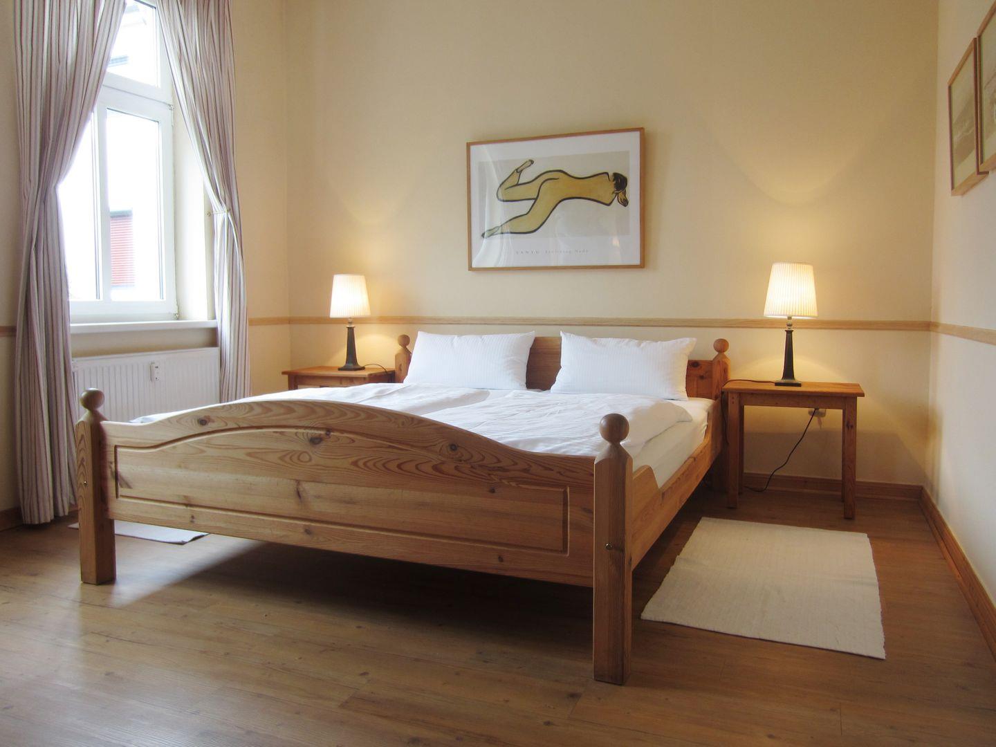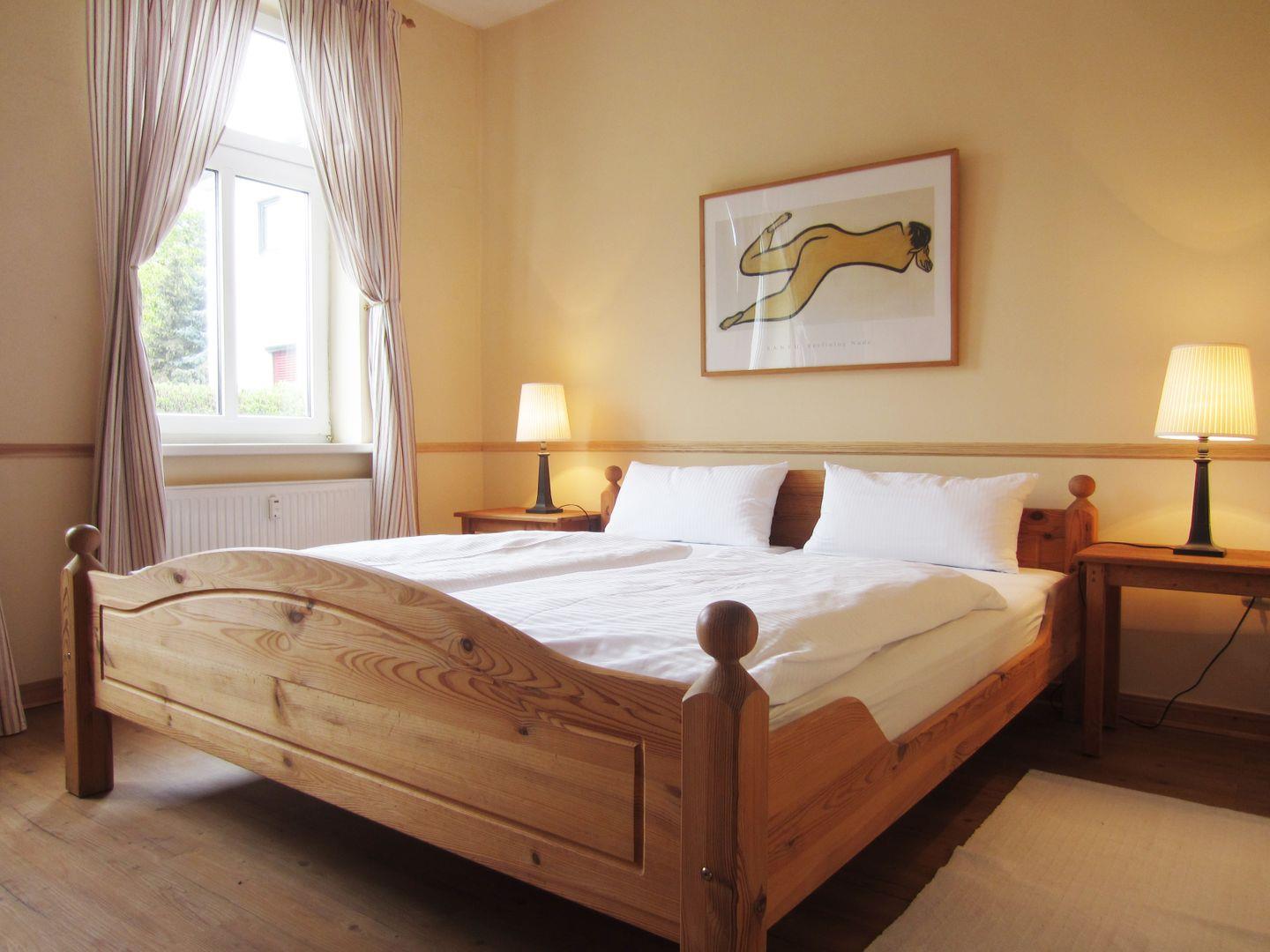 Das Schlafzimmer ist ebenfalls mit Laminat ausgelegt und bietet eine erholsame Schlafgelegenheit. Insgesamt stehen drei Schlafmöglichkeiten zur Verfügung, davon ein separater Schlafraum. Für Familien mit kleinen Kindern wird auf Wunsch ein Babybett bereitgestellt. Die Garderobe und die Kommode bieten zusätzlichen Stauraum.