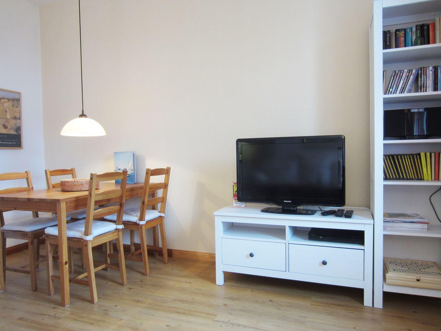 Das große freundliches Wohnzimmer mit Sofa (Schlafsofa) bietet einen modernen Flachbildfernseher mit HDMI- und USB – Anschluss, Blu-Ray- und DVD Player, Stereo-Kompaktanlage mit CD-Player und iPod/iPhone-Dockingstation. In der ganzen Wohnung gibt es WLAN.