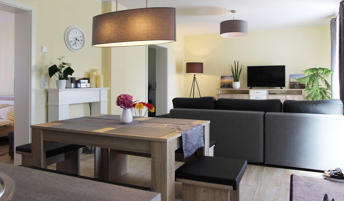Die Unterkunft entspricht modernen Ansprüchen an Komfort und Funktionalität. Sie finden zwei separate Schlafzimmer mit Laminatboden vor, die mit gemütlicher Bettwäsche ausgestattet sind. Fünf Schlafmöglichkeiten machen das Ferienhaus besonders attraktiv für Familien mit Kindern oder kleine Gruppen. Kinder sind ausdrücklich willkommen. Im offenen Wohn- und Essbereich, der ebenfalls mit Laminat ausgelegt ist, laden ein bequemes Sofa und eine separate Sofaecke zum Entspannen ein. Ein moderner Fernseher (35–44 Zoll, Satellitenanschluss) sorgt für Unterhaltung an ruhigen Abenden. Im Essbereich steht ein Esstisch zur Verfügung, an dem Sie gemeinsam Ihre Mahlzeiten genießen können.