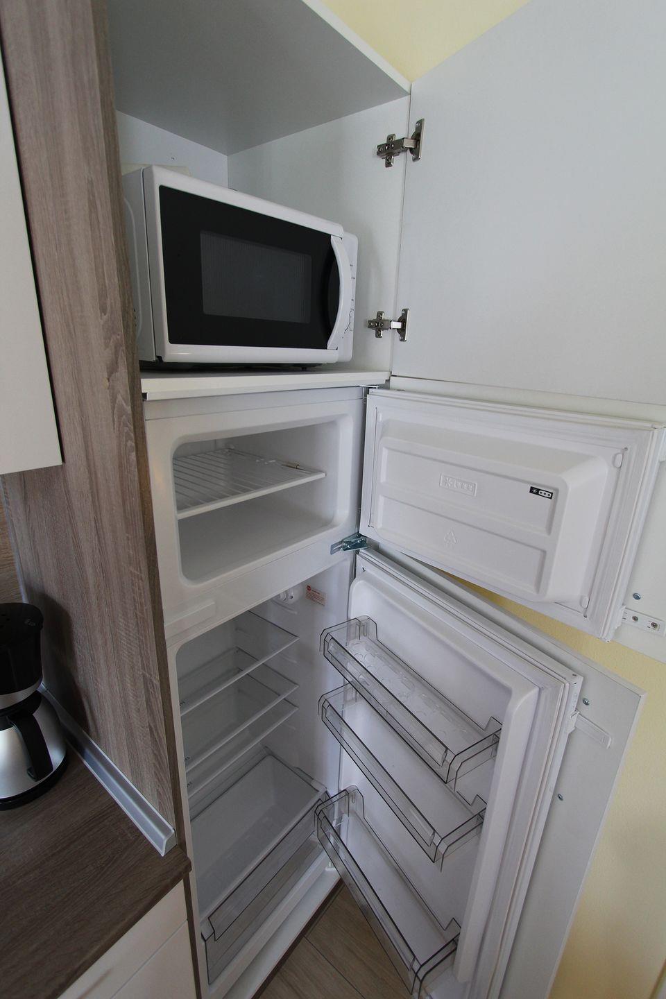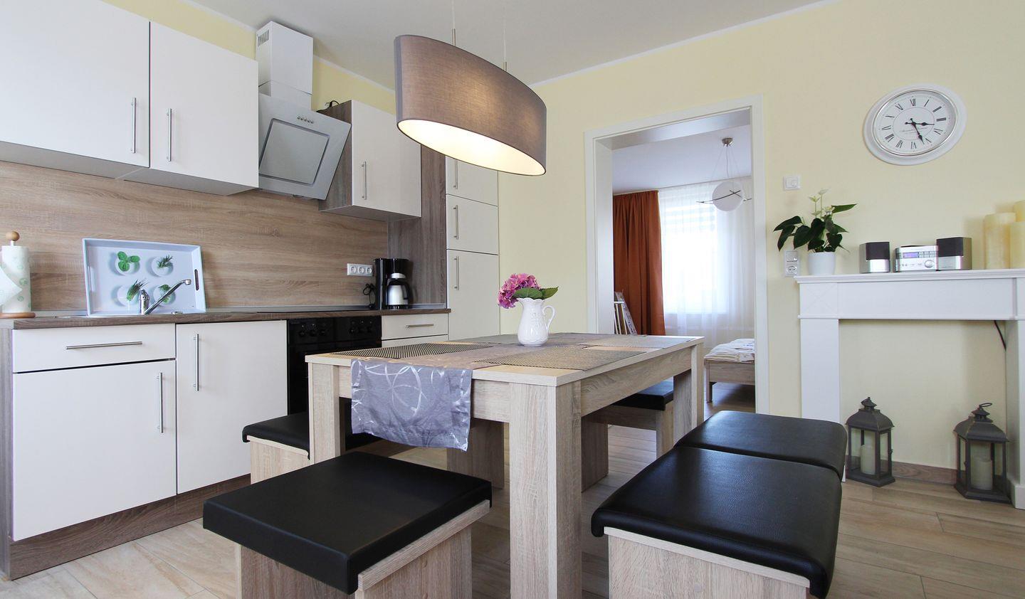 Die funktional offene Küche ist zum Wohnzimmer hin gestaltet und sehr gut ausgestattet. Sie nutzen einen Ceranherd, Backofen, Kühlschrank mit integriertem Gefrierfach, Mikrowelle sowie Kaffeemaschine, Toaster, Wasserkocher und alle notwendigen Küchenutensilien. Geschirr, Besteck, Geschirrhandtücher und eine Erstausstattung sind vorhanden, sodass Sie sich bequem selbst versorgen können.