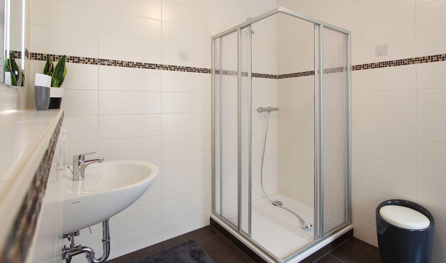 Das Badezimmer verfügt über eine bodengleiche Dusche, ein Waschbecken, einen Spiegel und Toilette sowie warmes Wasser. Die moderne und pflegeleichte Ausstattung macht es einfach, sich auch im Urlaub wohlzufühlen. Ein Wäscheständer, Staubsauger und Garderobe ergänzen das Angebot für einen komfortablen Aufenthalt.