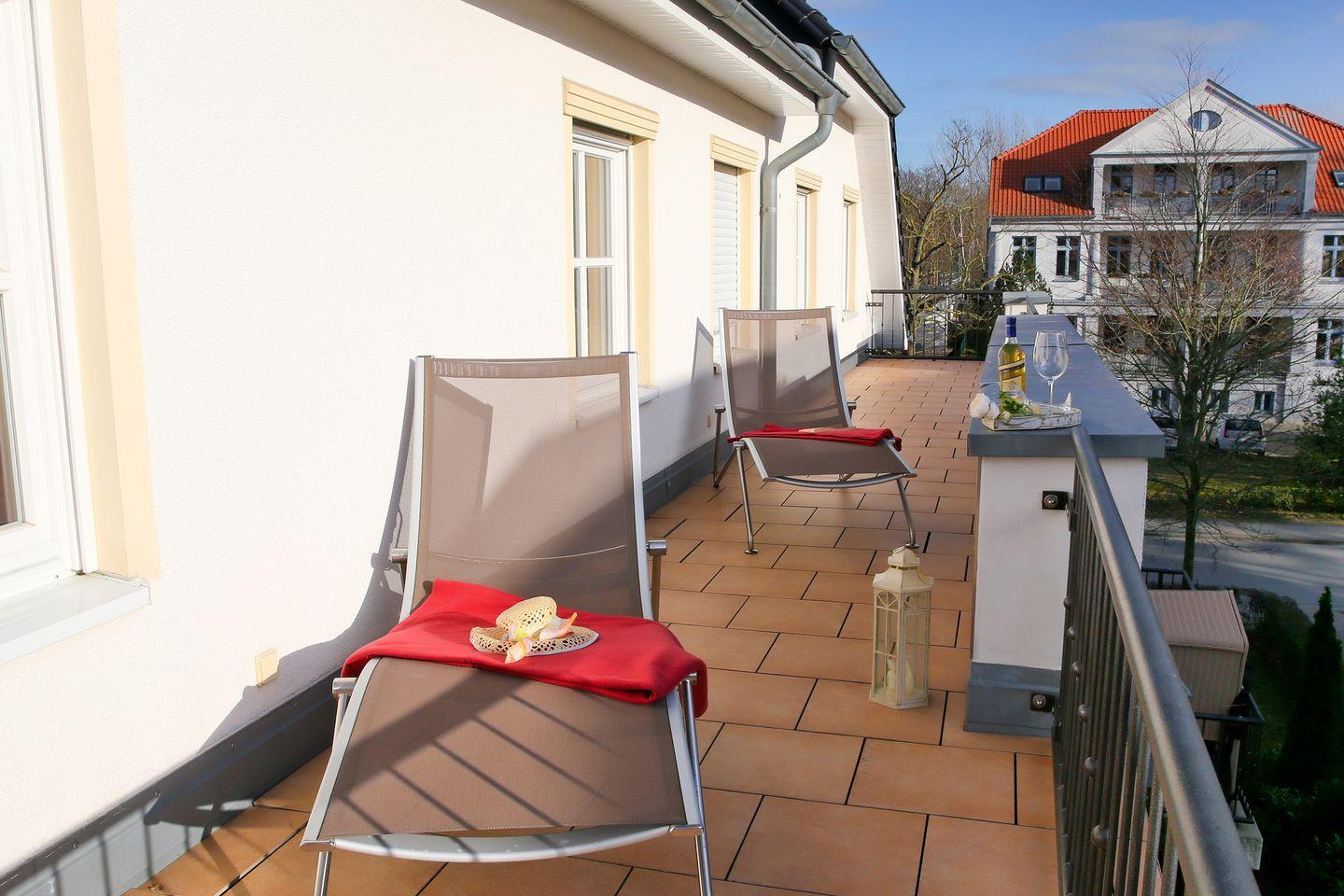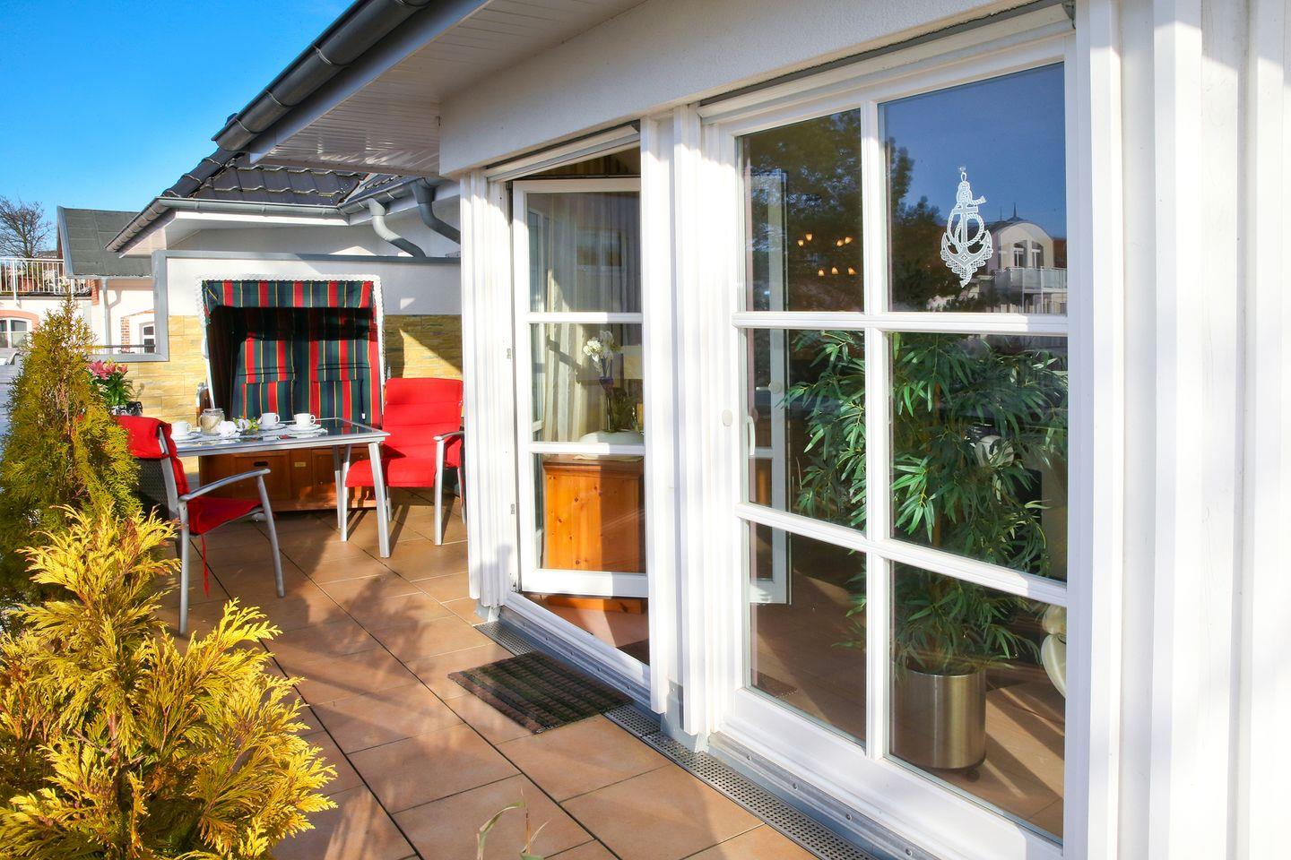 Die teils überdachte Dachterrasse mit Gartenmöbeln lädt dazu ein, die frische Meeresluft und den eingeschränkten Meerblick zu genießen – ob beim Frühstück oder beim Ausklingen des Tages. In der unmittelbaren Umgebung erwarten Sie attraktive Freizeitmöglichkeiten: Ob Spaziergänge am Ostseestrand, Radfahr- und Joggingtouren, Tennis, Schwimmen, Nordic Walking, Kulturangebote, Kirchen, Kino sowie zahlreiche Möglichkeiten zum Shopping und für Kosmetikbehandlungen. Familien finden nahegelegene Spielplätze und vielfältige Unternehmungsmöglichkeiten für Kinder.