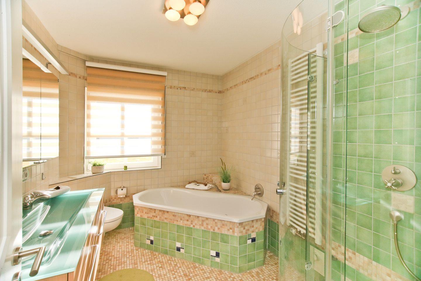 Im modernen Badezimmer stehen Ihnen eine bodengleiche Dusche, Badewanne, Waschbecken, Spiegel und ausreichend Ablagefläche zur Verfügung. Zusätzlich sorgt ein separates Gäste-WC für mehr Komfort. Für längere Aufenthalte stehen Ihnen eine eigene Waschmaschine und praktische Haushaltsgeräte wie Wäscheständer und Staubsauger bereit.