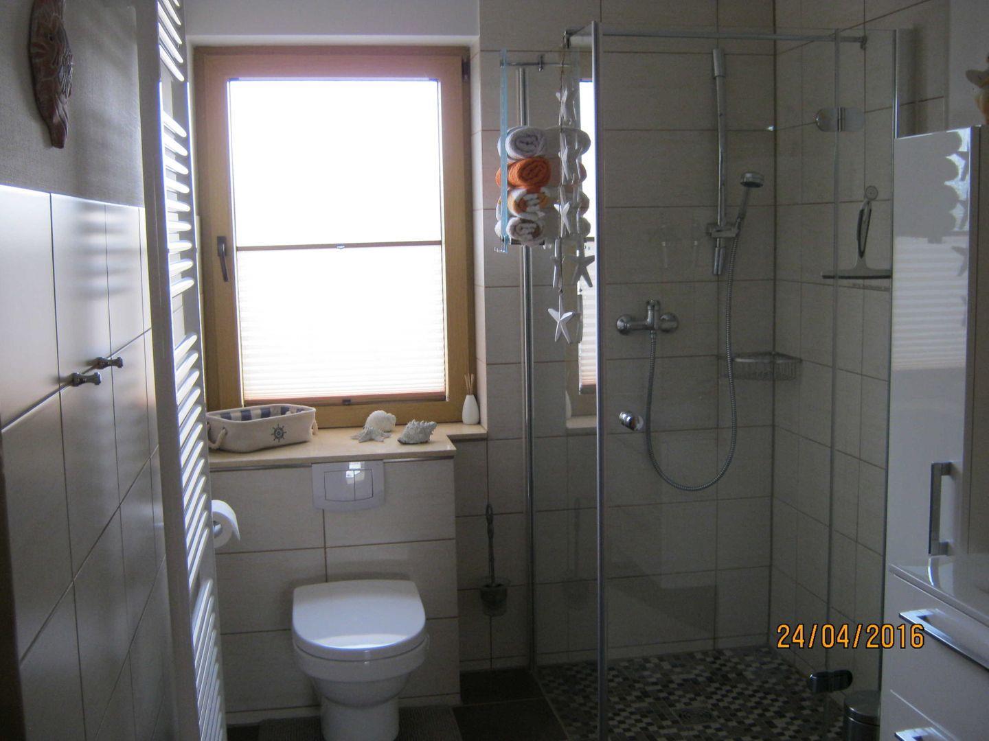 Das moderne Badezimmer überzeugt mit ebenerdiger Dusche, WC und Föhn.