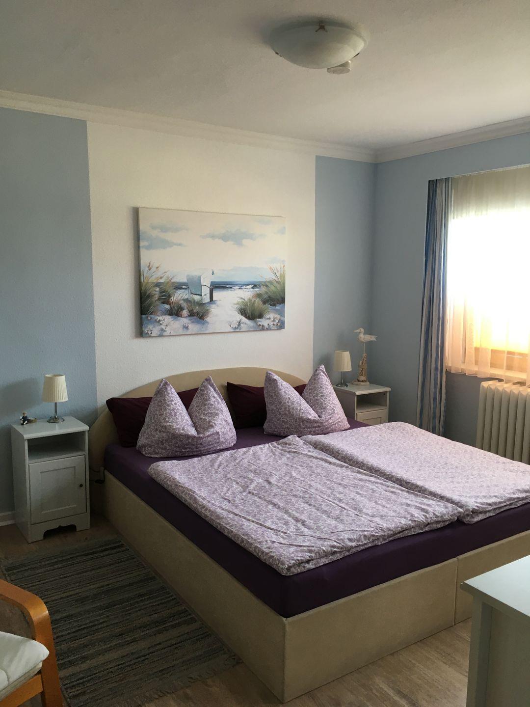 Unsere helle und gemütliche Ferienwohnung im 1. Obergeschoss bietet auf rund 90 m² viel Platz für bis zu 5 Personen. Zwei Schlafzimmer mit komfortablen Doppelbetten und großzügigen Kleiderschränken sowie ein weiteres Schlafzimmer mit Einzelbett sorgen für erholsamen Schlaf. Für unsere kleinen Gäste stehen ein Kinderreisebett, ein Babybett und ein Hochstuhl bereit.