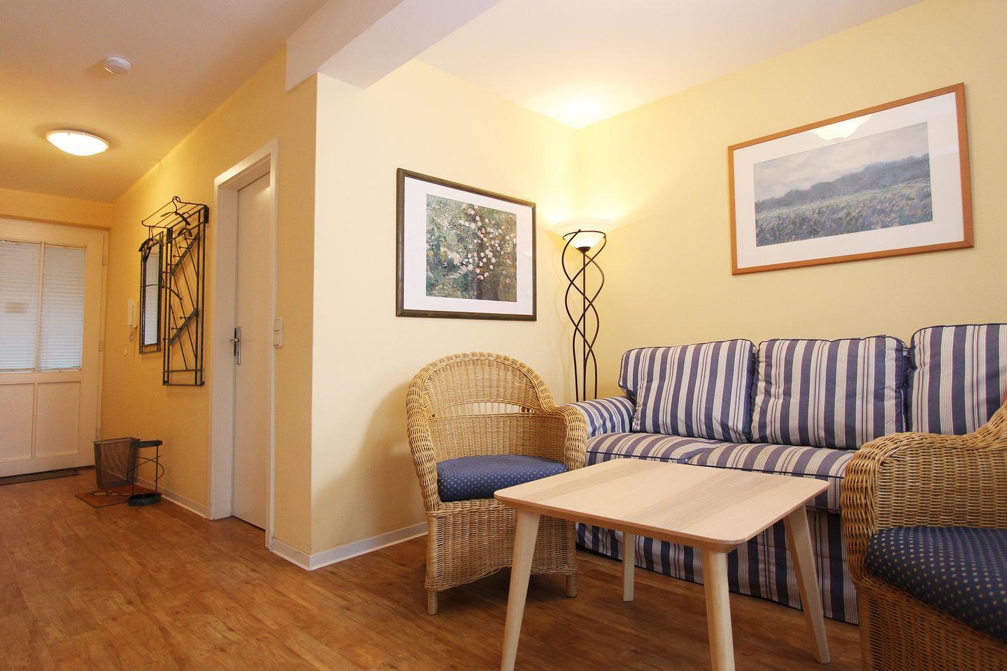 Nichtraucherwohnung, 3 Zimmer, 3.OG mit Fahrstuhl, ca 48 m², Küchenzeile mit Ceranfeld, Geschirrspüler und Eßplatz, Duschbad, Farb- TV, 1 Schlafzimmer mit Doppelbett, 1 Schlafzimmer mit Doppelbett 1,40 breit, Kinderreisebett, Hochstuhl, Balkon nach Westen, seitlicher Meerblick, W-Lan, im Haus wird Brötchenservice angeboten, PKW-Tiefgaragenstellplatz mit Doppelparker - Autohöhe nur 1,70 m erlaubt und bis max. Gewicht 2000 kg, keine Haustiere