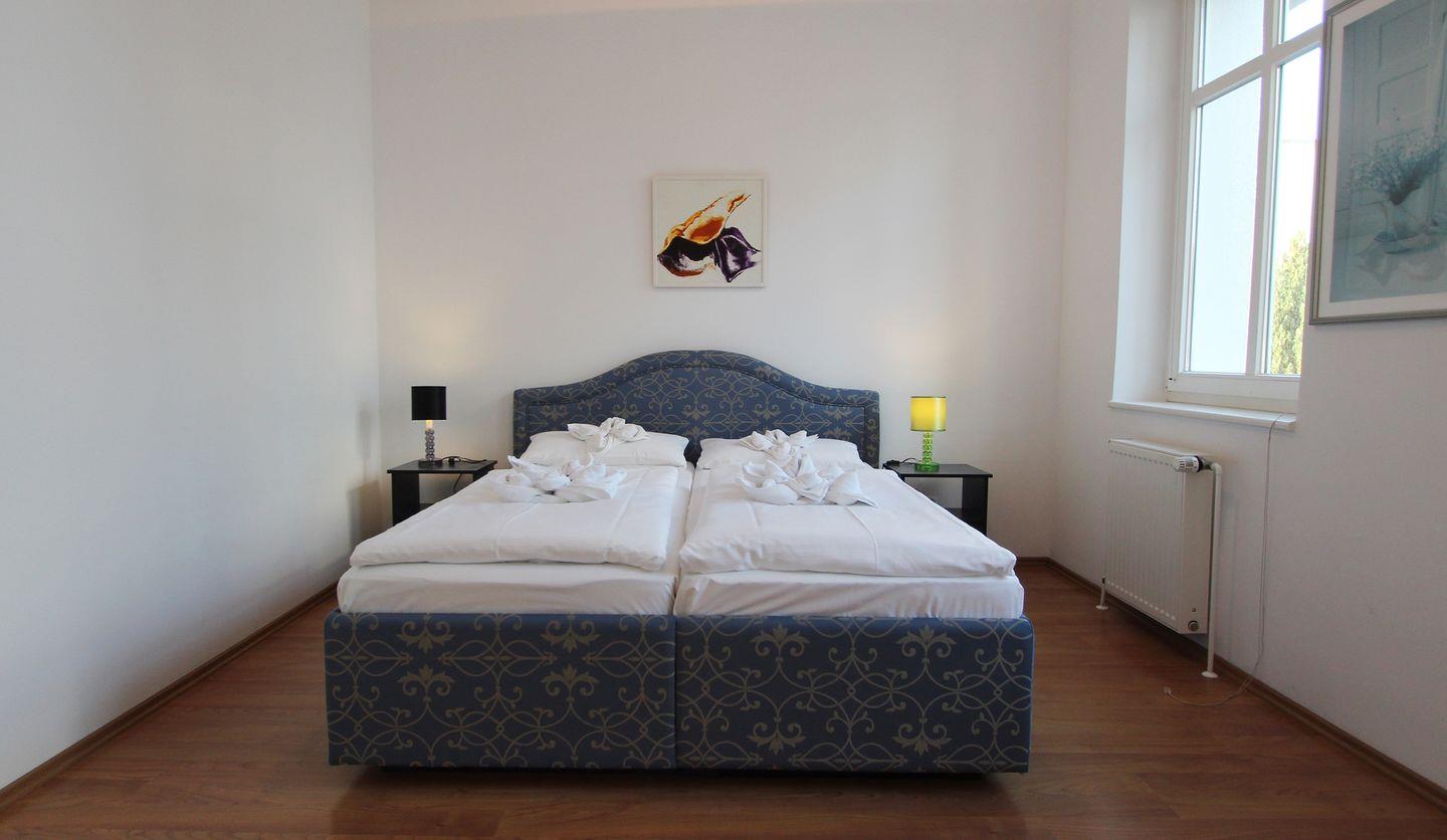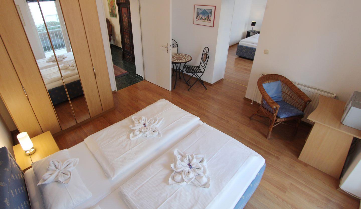 Die Ferienwohnung befindet sich in der Villa Sanssouci im Hochparterre. Der Balkon nach Westen bietet Platz für entspannte Stunden. Die Villa Sanssouci liegt in der Haupteinkaufsstraße mit seinen vielen Geschäften und Restaurants, auch der nächste Bäcker für frische Brötchen ist nicht weit entfernt. Die Wohnung hat eine Wohnzimmer mit großer Küchenzeile, zwei Schlafzimmer mit Doppelbett, Bad mit Dusche.