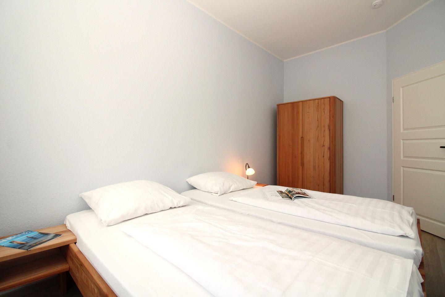 Das separate und zusätzliche 2. Schlafzimmer verfügt ebenfalls über ein bequemes Doppelbett (2 x 90 cm x 200 cm), Nachttische mit Nachttischlampen, einen geräumigen Kleiderschrank sowie einen Wandspiegel.