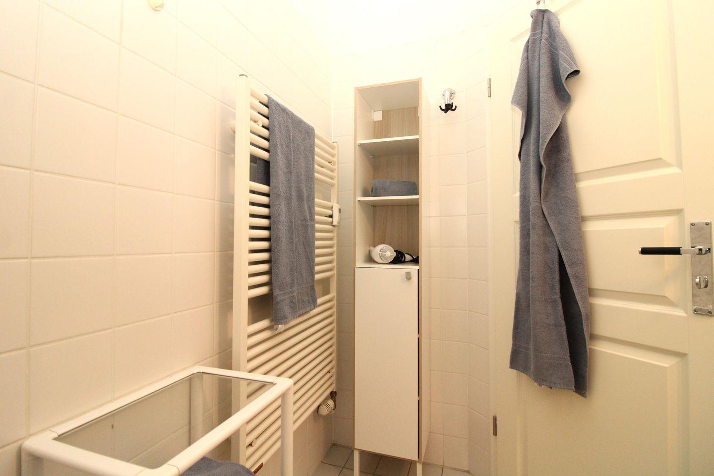 Das Badezimmer verfügt über eine Dusche, Waschbecken, WC, Badezimmerschrank und Regal, Handtuch-Heizkörper, Föhn sowie ausreichend Ablagemöglichkeiten.