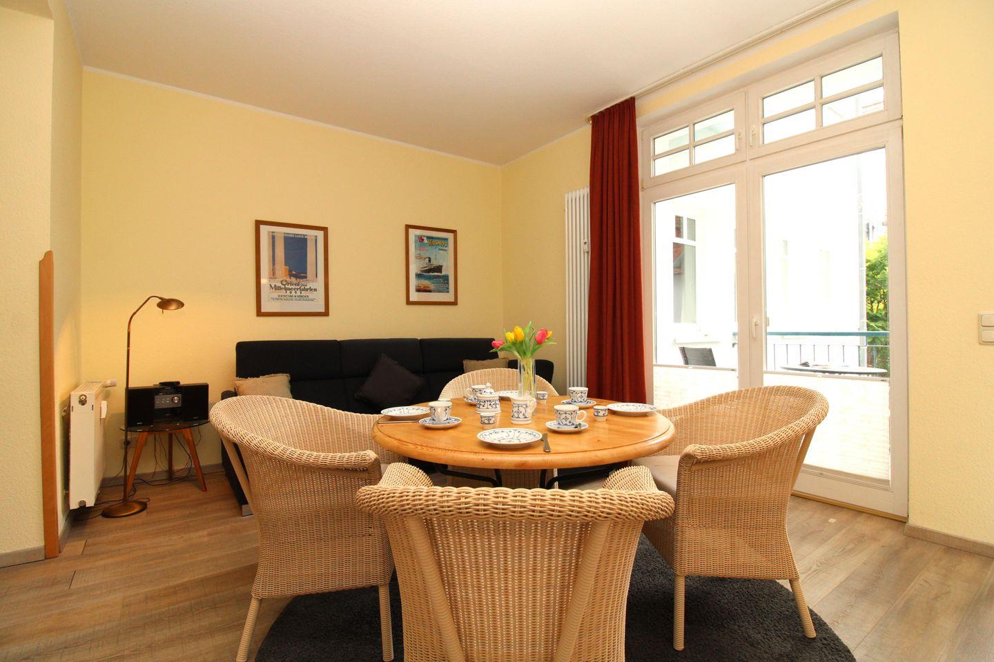 Das freundliche und helle Wohn-/Esszimmer verfügt über eine separate Sitzgruppe mit bequemer (ausziehbarer Schlaf-) Couch und Couchtisch, einen separaten Esstisch mit 4 Korbsesseln sowie ein Sideboard. Vom Wohnzimmer aus haben Sie direkten Zugang zu dem ca. 4 m² großen Balkon (nach Osten zum Innenhof ausgerichtet) mit Balkonmöbeln. Hier sitzen Sie entspannt und gemütlich und können abends bei einem guten Glas Wein in Ruhe die lauen Sommernächte genießen.