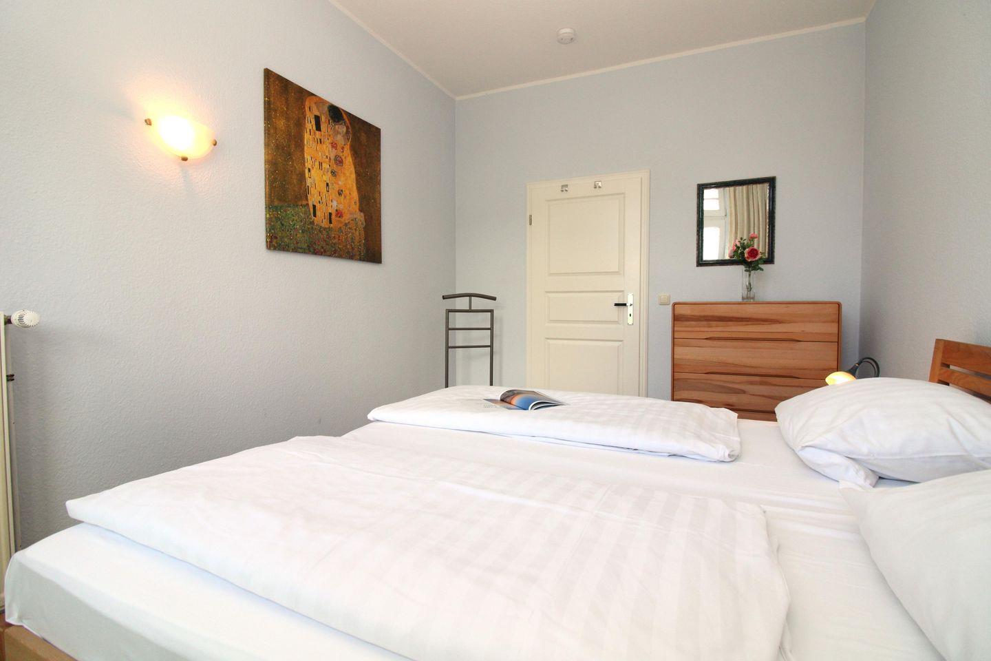 Das geräumige 1. Schlafzimmer ist mit einem bequemen Doppelbett (2 x 100 cm x 200 cm), Nachttischen mit Nachttischlampen, einem geräumigen Kleiderschrank (in der Diele), einer Kommode, einem Wandspiegel sowie einem Stuhl eingerichtet.
