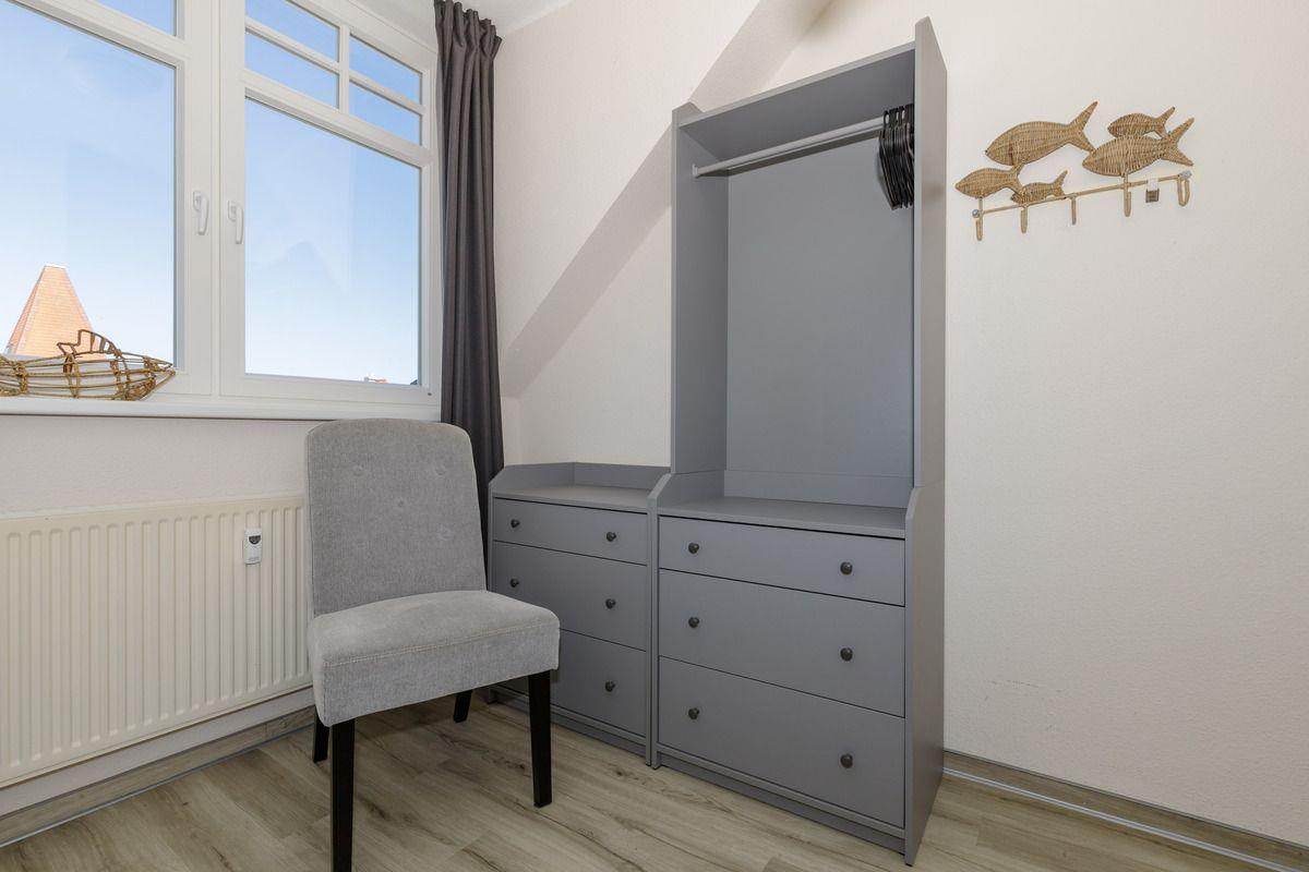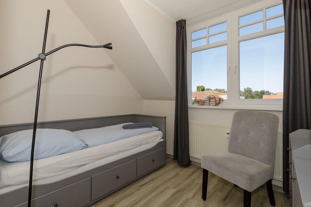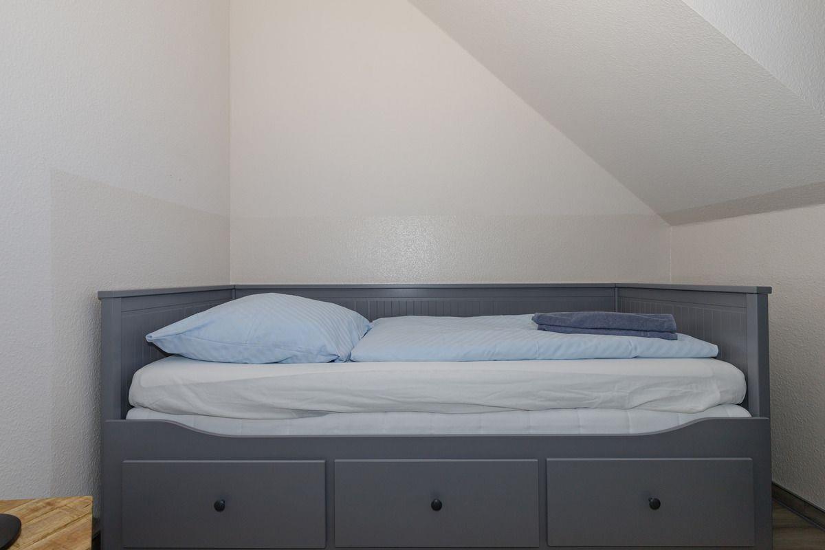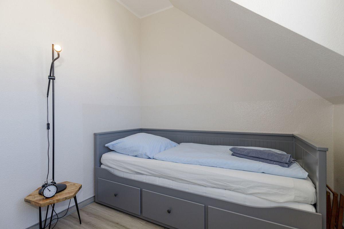 Das separate und zusätzliche 2. Schlafzimmer verfügt über ein bequemes Einzelbett, welches mittels Ausziehfunktion auch als Doppelbett (2 x 80 x 200 cm) cm) genutzt werden kann. Weiterhin beinhaltet dieses Zimmer einen Nachttisch mit Lampe, eine Garderobenleiste sowie einen Kleiderschrank.