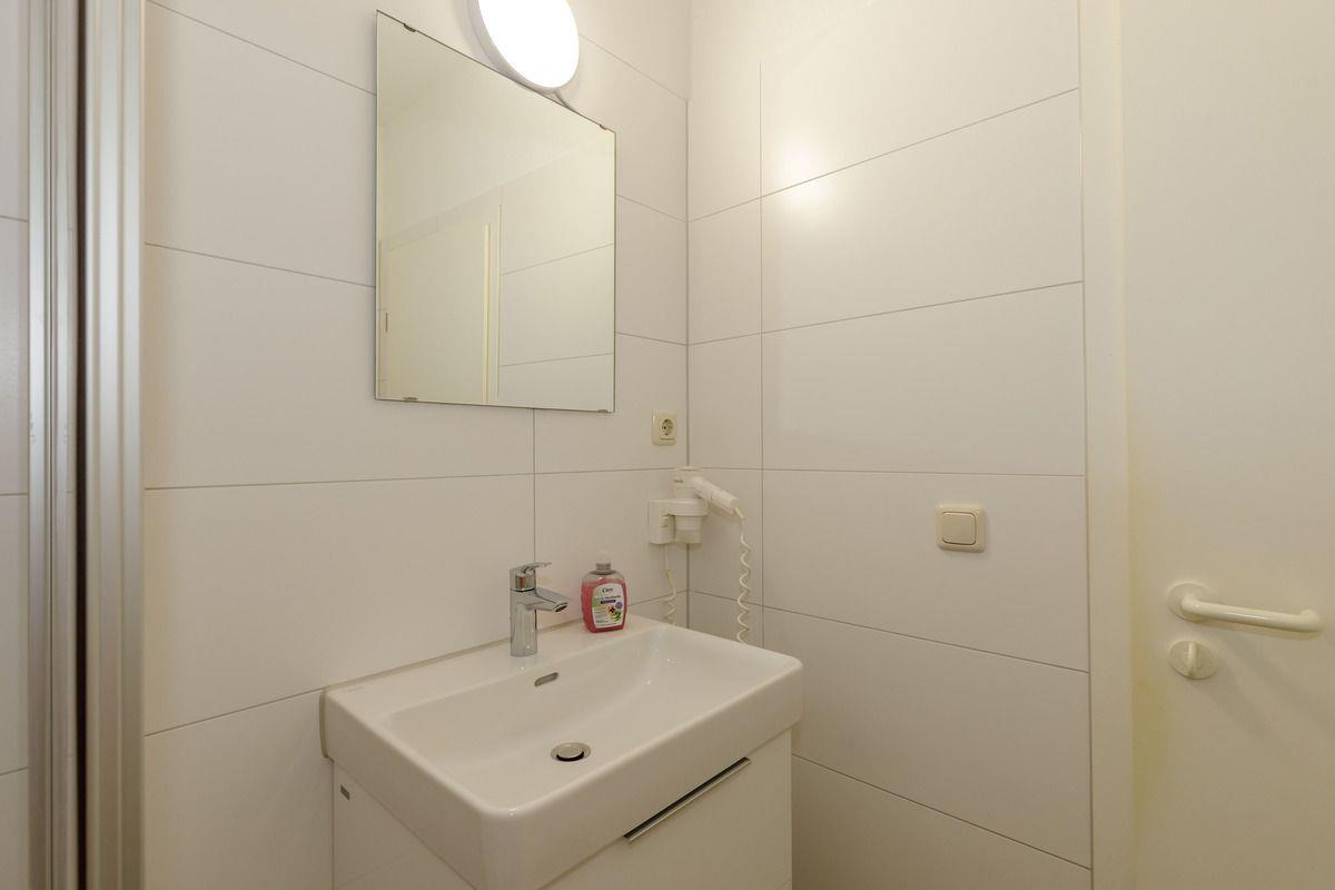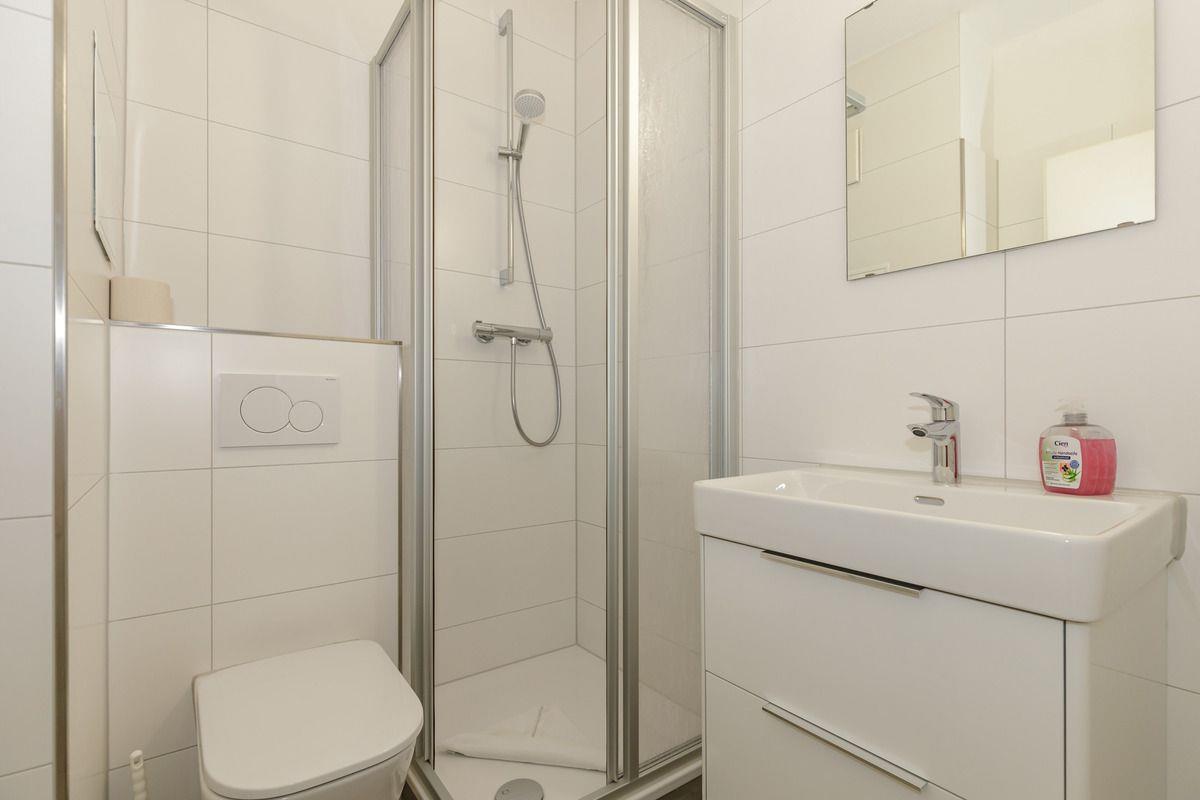 Das helle und moderne Badezimmer verfügt über eine Dusche mit niedrigem Einstieg, Waschbecken mit Unterschrank, WC, Föhn, Handtuch-Heizkörper sowie ausreichend Ablagemöglichkeiten.