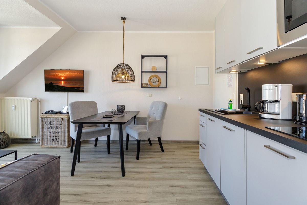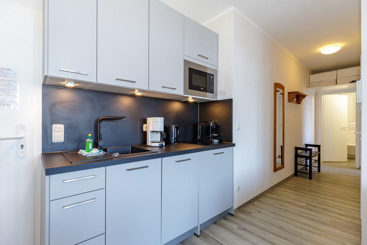 Die offene Küche beinhaltet eine voll ausgestattete Einbauküchenzeile mit 2-Zonen-Ceran-Kochfeld, Dunstabzug, Mikrowelle, Kühlschrank mit Gefrierfach, Geschirrspülmaschine, Kaffeemaschine, Wasserkocher und Toaster. Auf Wunsch stellen wir Ihnen auch gerne einen portablen Backofen zur Verfügung. Die Küche ist mit Geschirr, Gläsern, Besteck und Töpfen komplett ausgestattet.