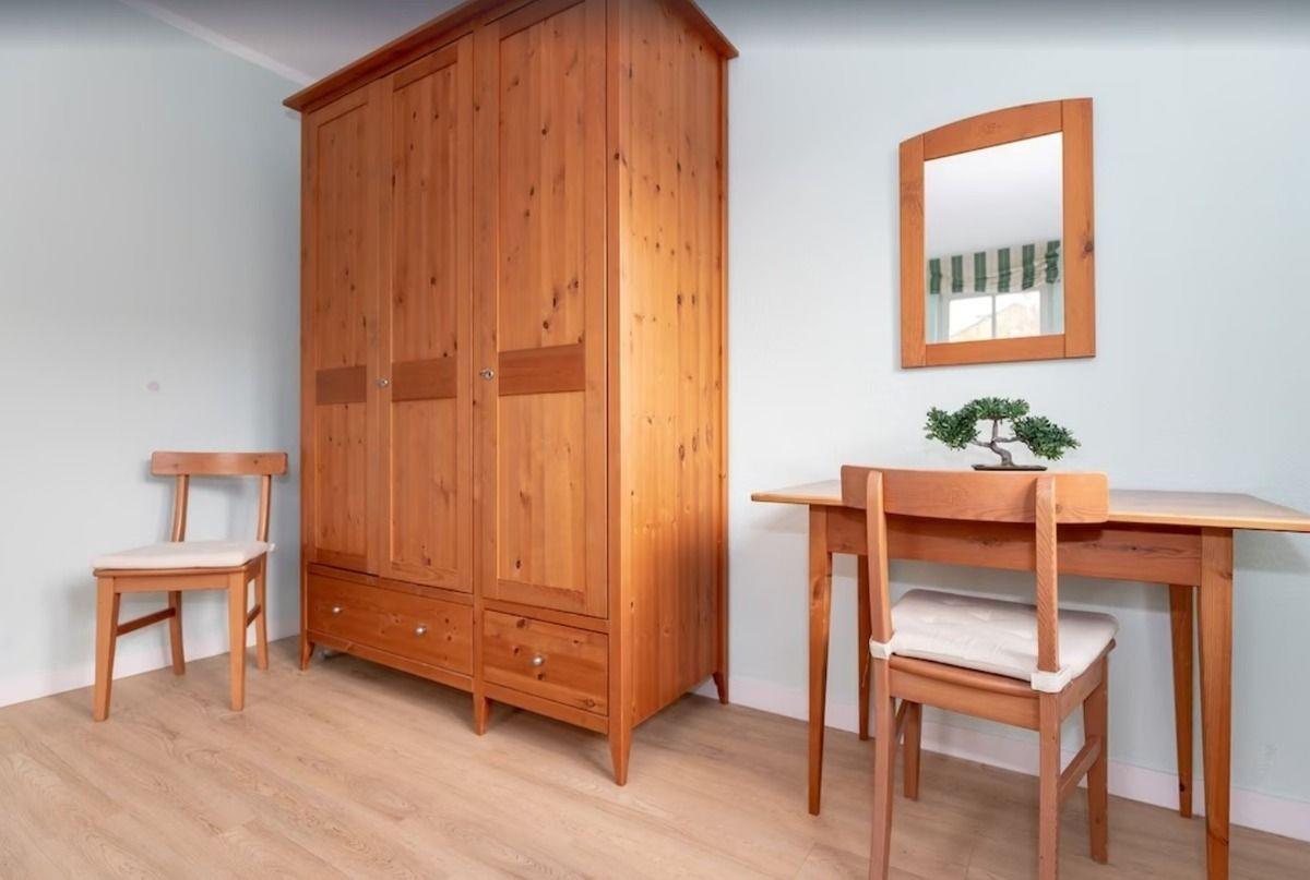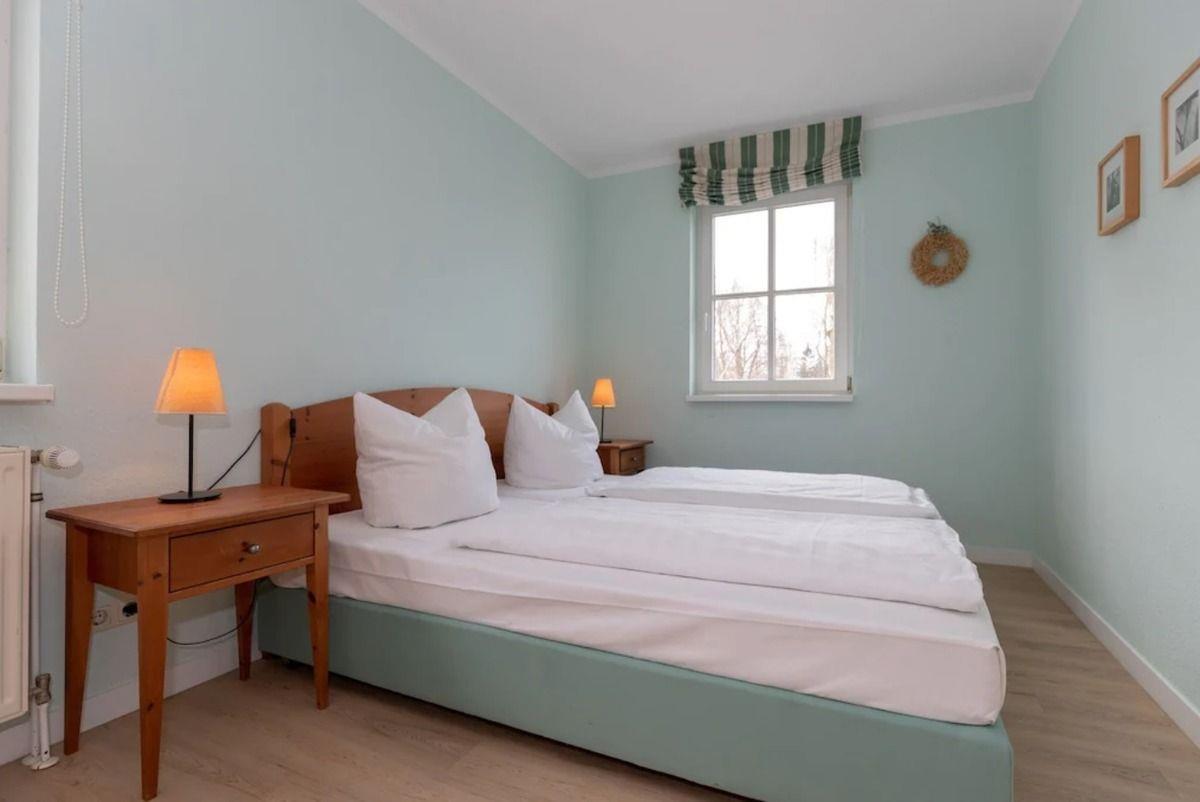 Das geräumige Schlafzimmer ist mit einem bequemen Doppelbett (2 x 90 cm x 200 cm), Nachttischen mit Nachttischlampen, einem Schminktisch mit Stuhl und Wandspiegel sowie einem geräumigen Kleiderschrank eingerichtet.