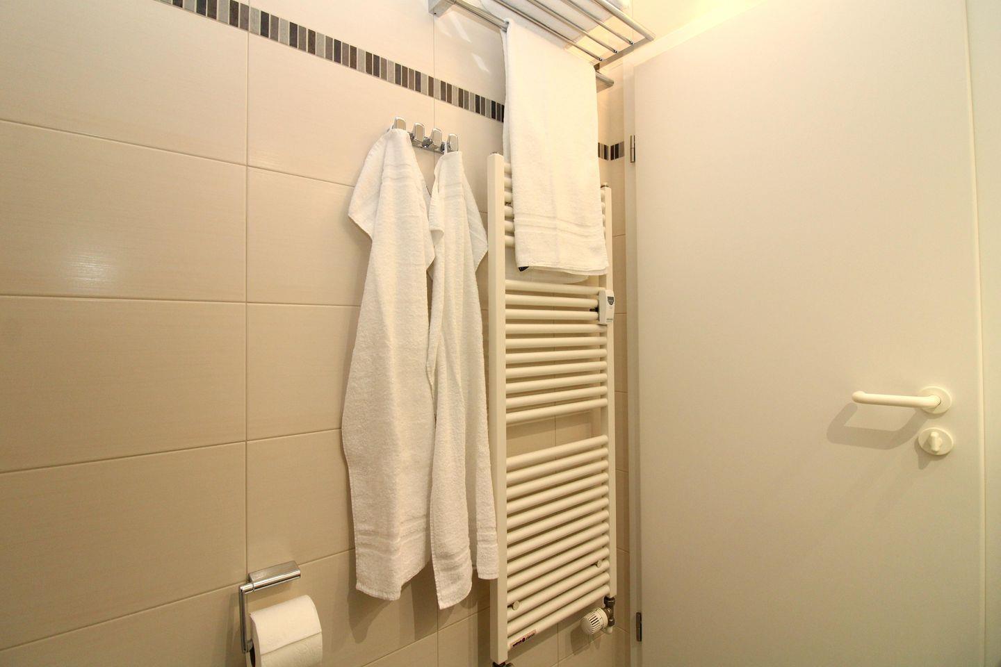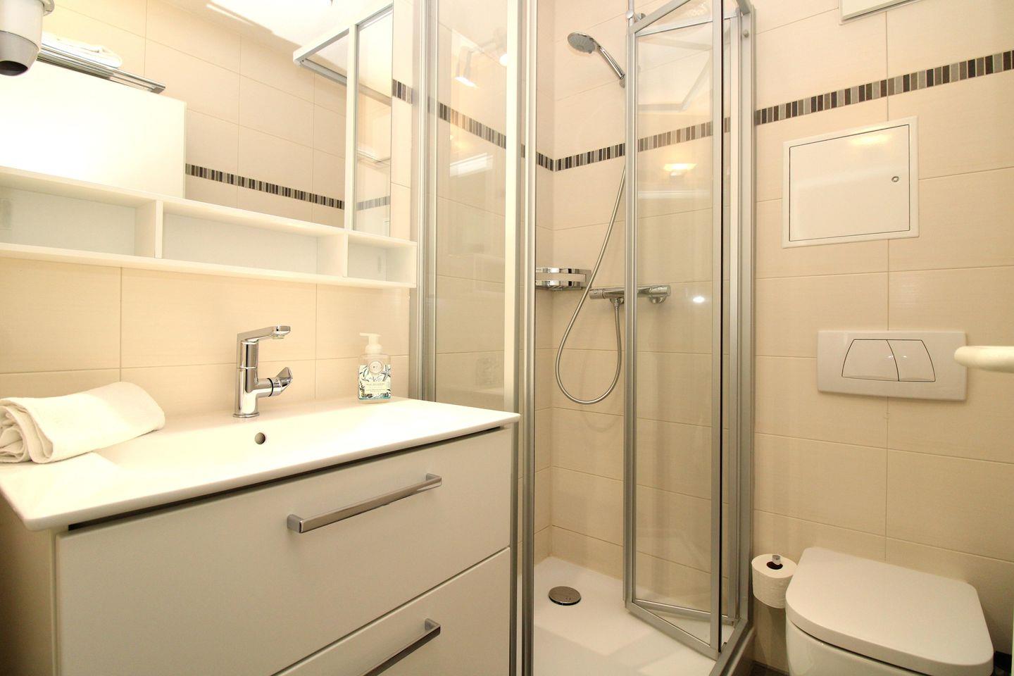 Das moderne Badezimmer verfügt über eine Echtglas-Dusche mit niedrigem Einstieg, einen Waschtisch mit Unterschrank und Spiegel, WC, Handtuch-Heizkörper, Föhn sowie ausreichend Ablagemöglichkeiten.