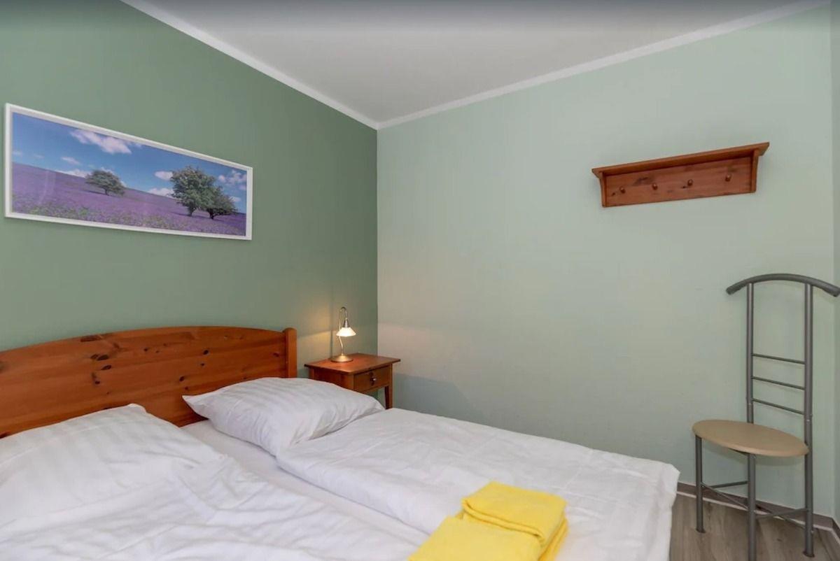 Das Schlafzimmer ist mit einem bequemen Doppelbett (2 x 90 cm x 200 cm), Nachttischen mit Nachttischlampen, einem geräumigen Kleiderschrank (im Eingangsbereich), 2 Stühlen und einer Garderobenleiste eingerichtet.