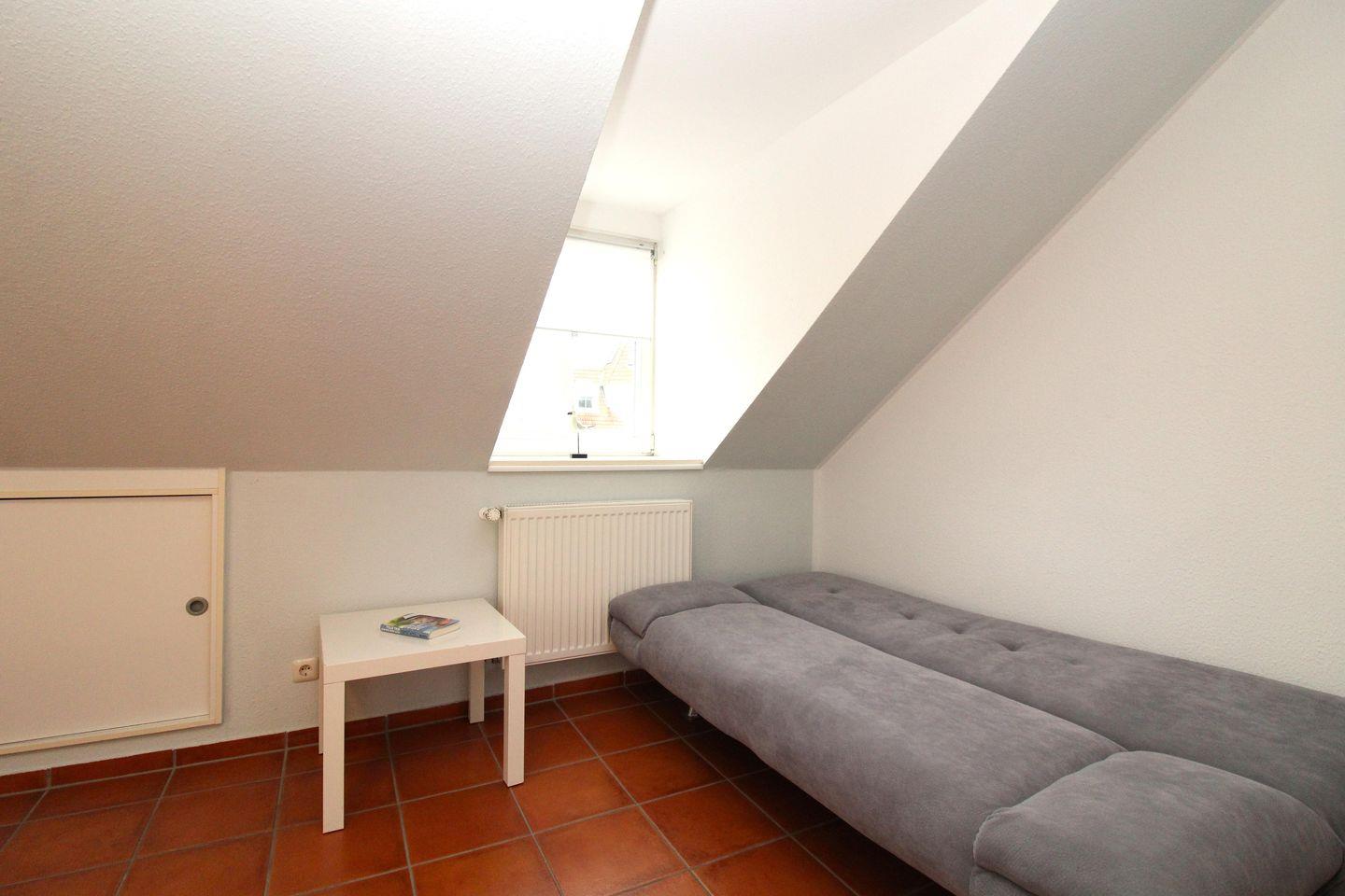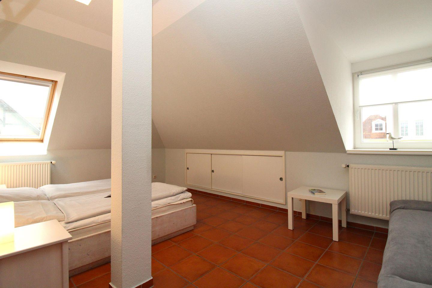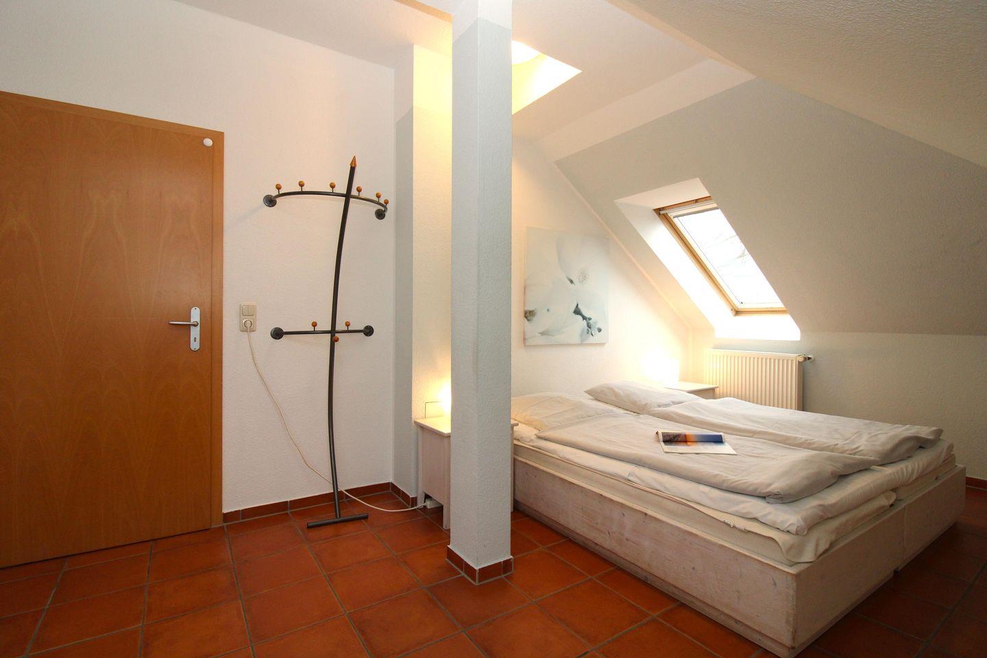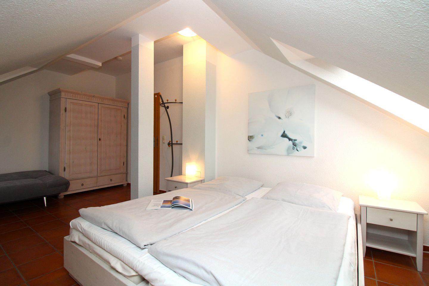 Das gemütliche Schlafzimmer ist mit einem bequemen Doppelbett (180 cm x 200 cm), Nachttischen mit Nachttischlampen sowie einem geräumigen Kleiderschrank eingerichtet. In den Dachschrägen sind als zusätzlicher Stauraum für Ihre Garderobe und Ihr Reisegepäck mehrere geräumige Einbauschränke eingebaut.