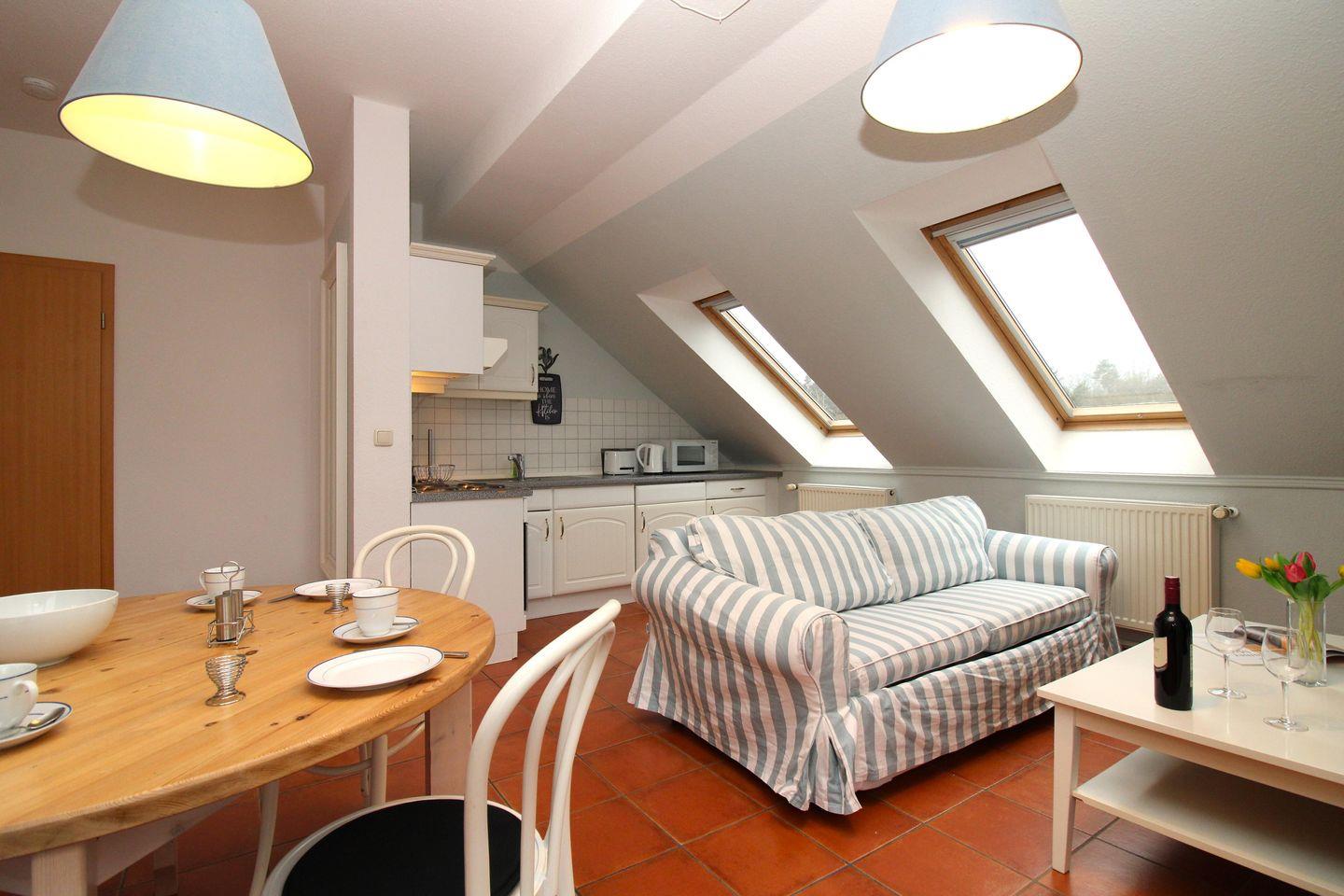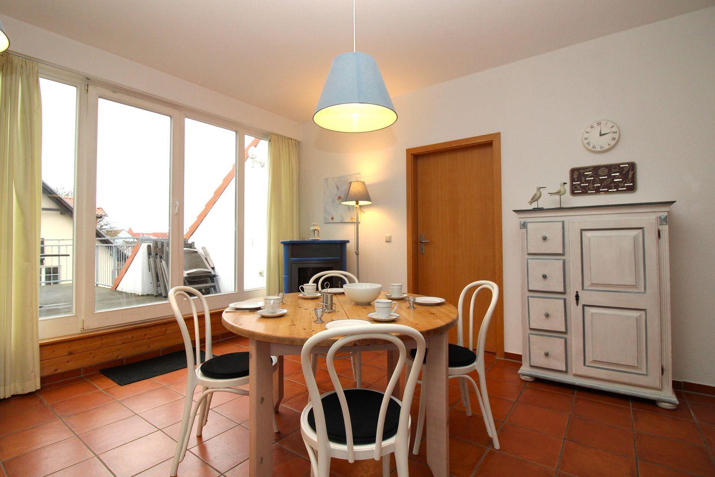 Das freundliche und geräumige Wohn-/Esszimmer verfügt über eine separate Sitzgruppe mit bequemer Couch, Couchtisch, einen separaten Esstisch mit 4 Stühlen sowie ein Sideboard. Vom Wohnzimmer aus haben Sie direkten Zugang zu der ca. 17 m² großen und sonnigen Dachterrasse. Hier sitzen Sie entspannt und gemütlich mit weitem Blick über die Dächer von Kühlungsborn und können sich ausgiebig sonnen oder abends bei einem guten Glas Wein in Ruhe die lauen Sommernächte genießen!