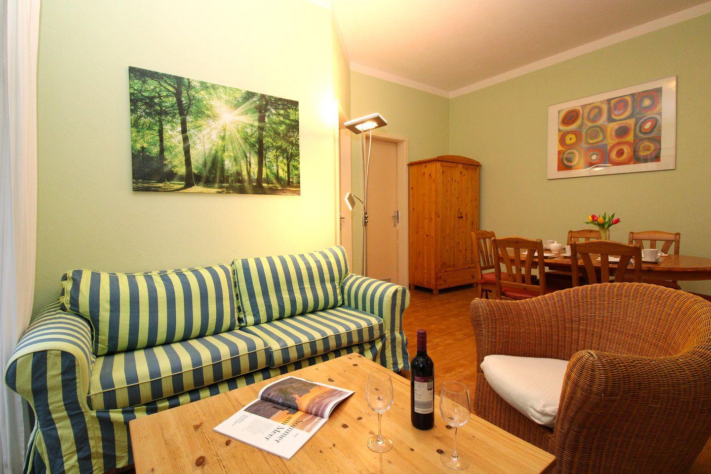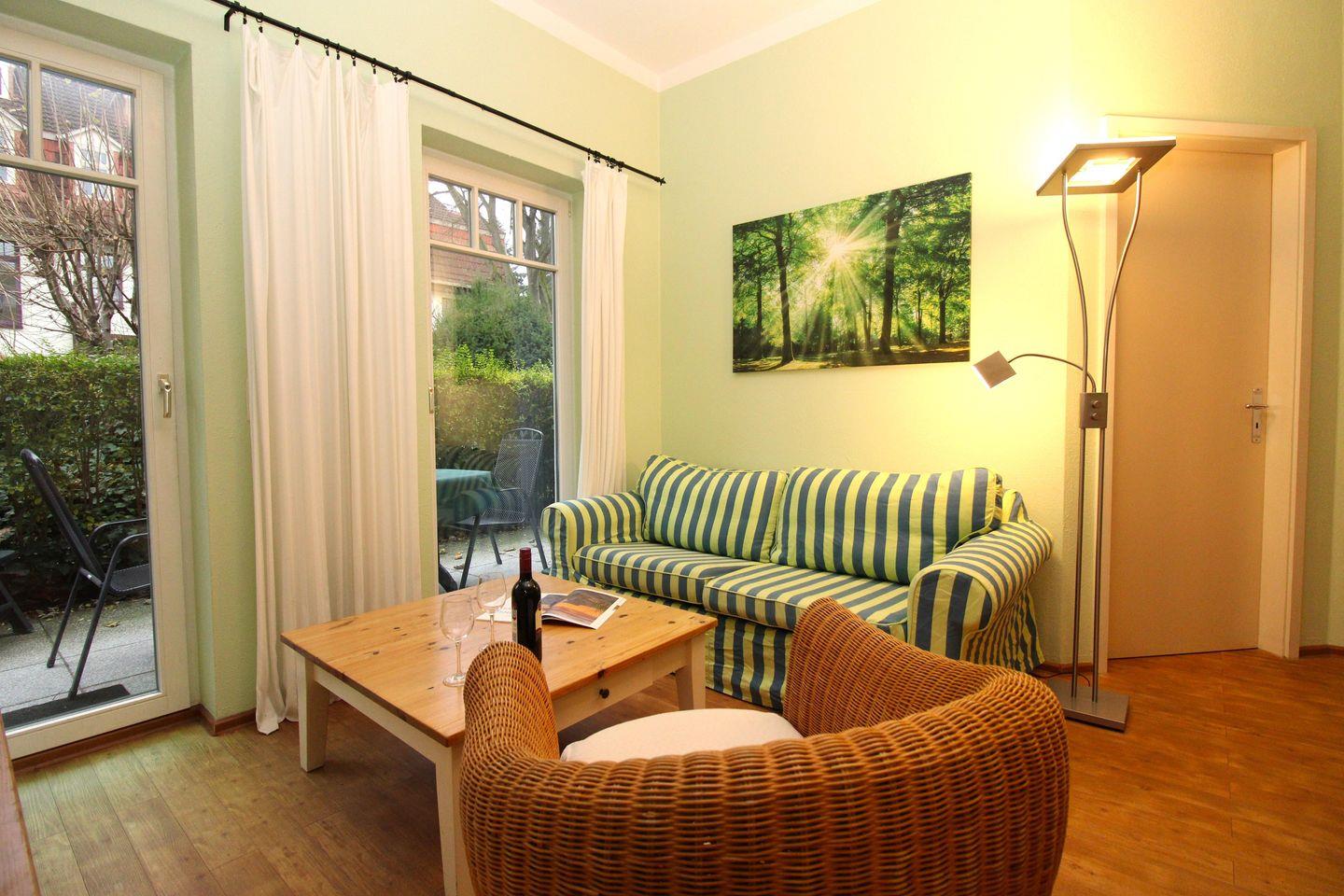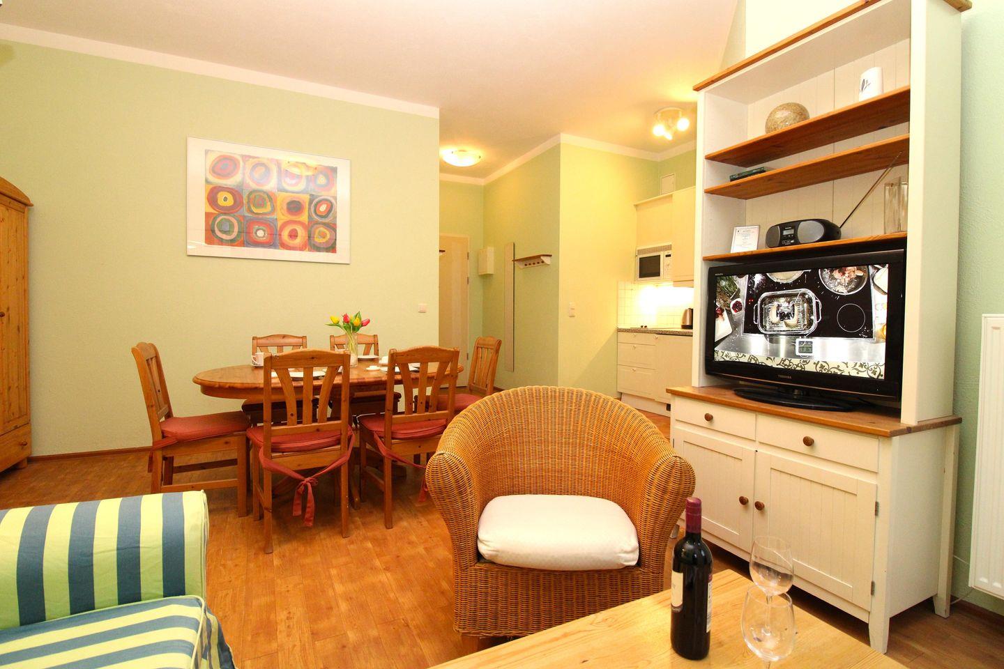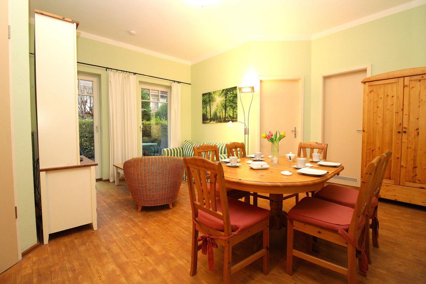 Das gemütliche Wohn-/Esszimmer verfügt über eine separate Sitzgruppe mit bequemer Couch, Korbsessel und Couchtisch, einen separaten Esstisch mit 6 Stühlen, einen Schrank sowie eine Vitrine. Vom Wohnzimmer aus haben Sie direkten Zugang zu der ca. 10 m² großen und sonnigen Terrasse (nach Süden ausgerichtet) mit Terrassenmöbeln. Hier sitzen Sie entspannt und gemütlich im Grünen und können abends bei einem guten Glas Wein in Ruhe die lauen Sommernächte genießen!