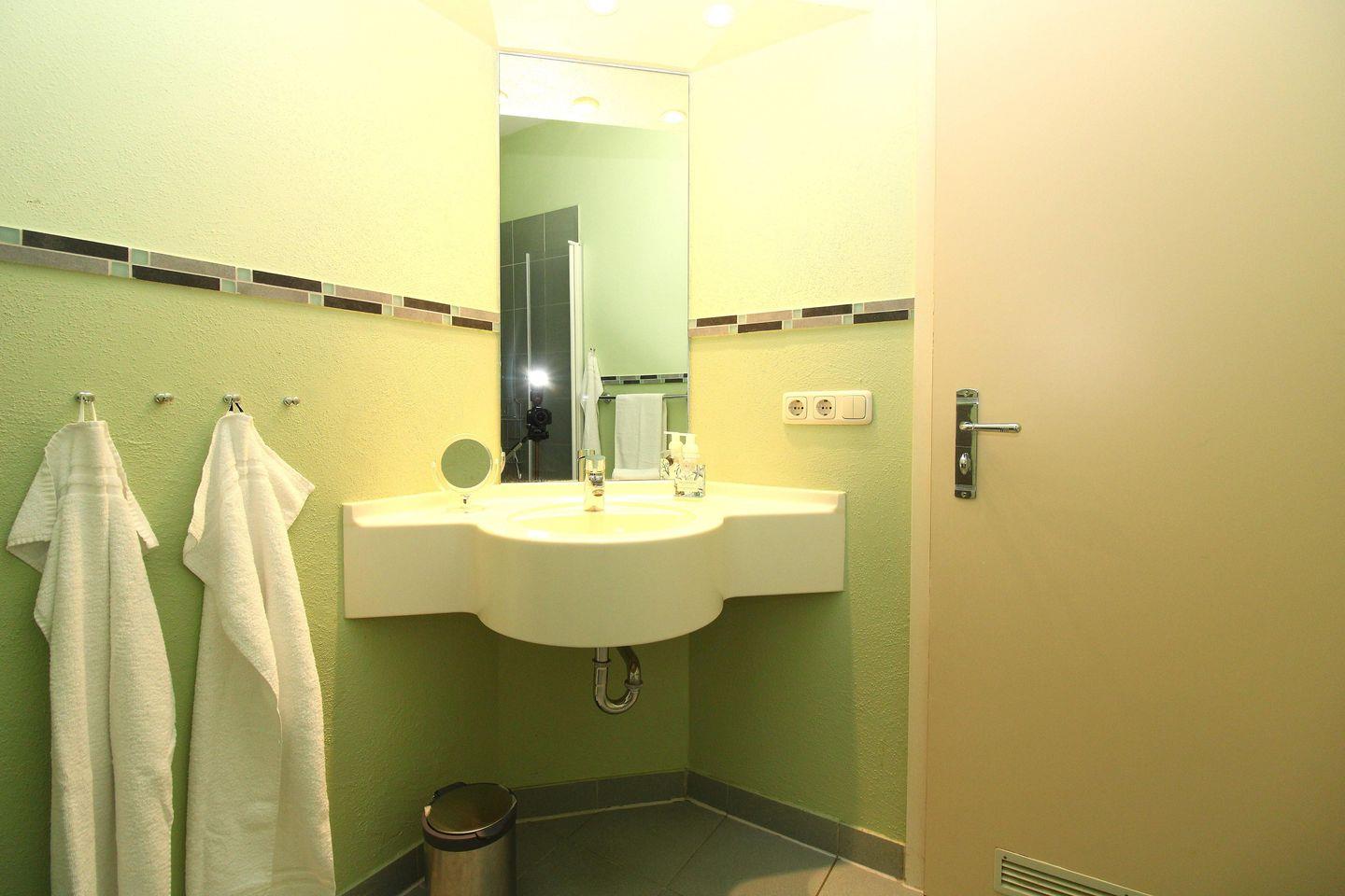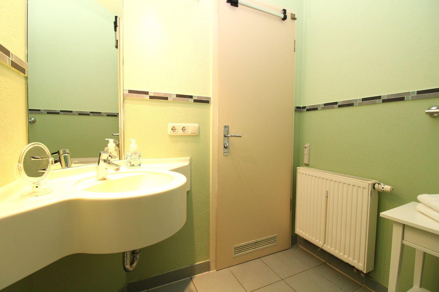 Das Badezimmer verfügt über eine Dusche, Waschbecken und WC, Kosmetikspiegel, einen kleinen Ablagetisch, einen Handtuch-Heizkörper sowie ausreichend Ablagemöglichkeiten.