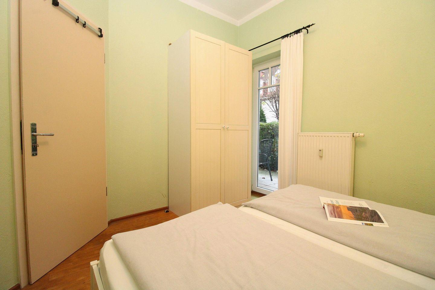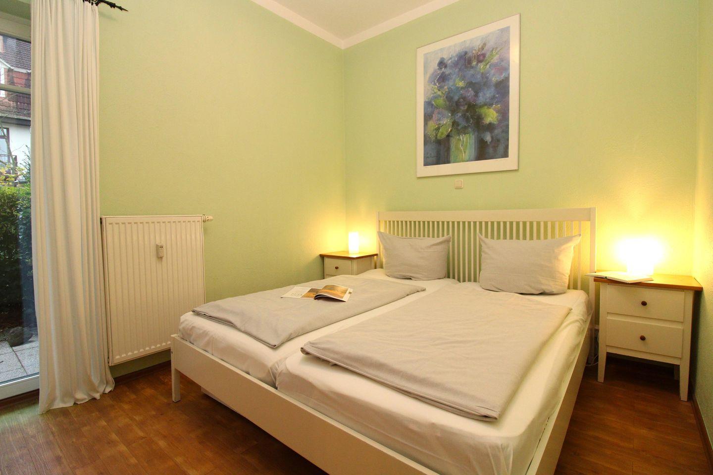Das freundliche 1. Schlafzimmer ist mit einem bequemen Doppelbett (2 x 90 cm x 200 cm), Nachttischen mit Nachttischlampen sowie einem Kleiderschrank eingerichtet und hat ebenfalls einen direkten Zugang zur Terrasse.