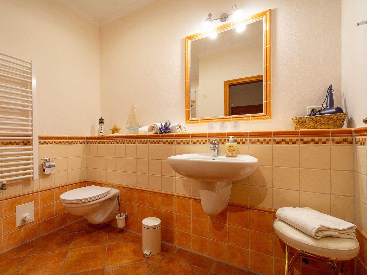 Das mediterran anmutende Badezimmer verfügt über eine Dusche mit bodengleichem Einstieg (seniorenfreundlich!), Waschbecken und WC, Föhn, Hocker, Handtuch-Heizkörper sowie ausreichend Ablagemöglichkeiten.