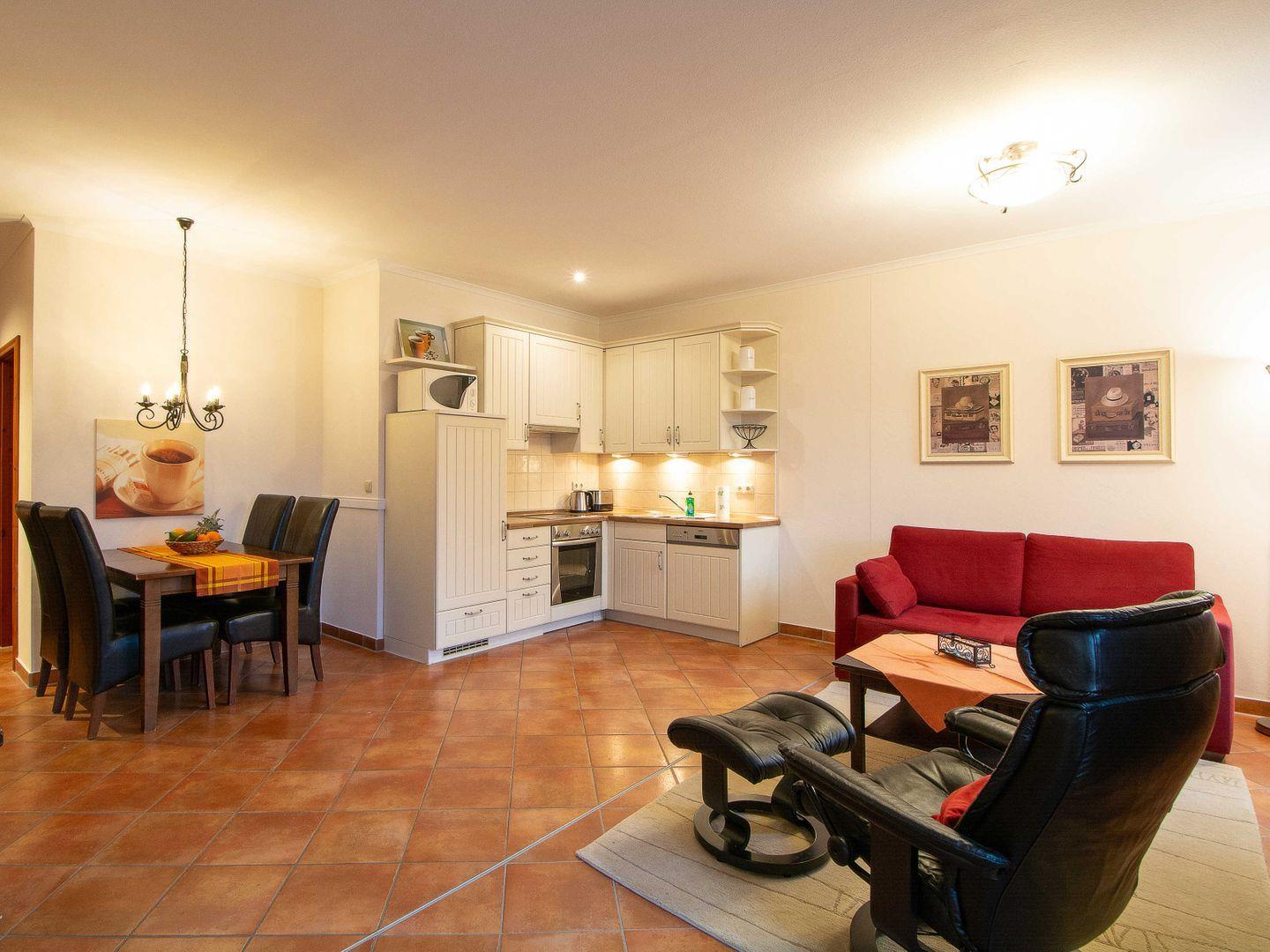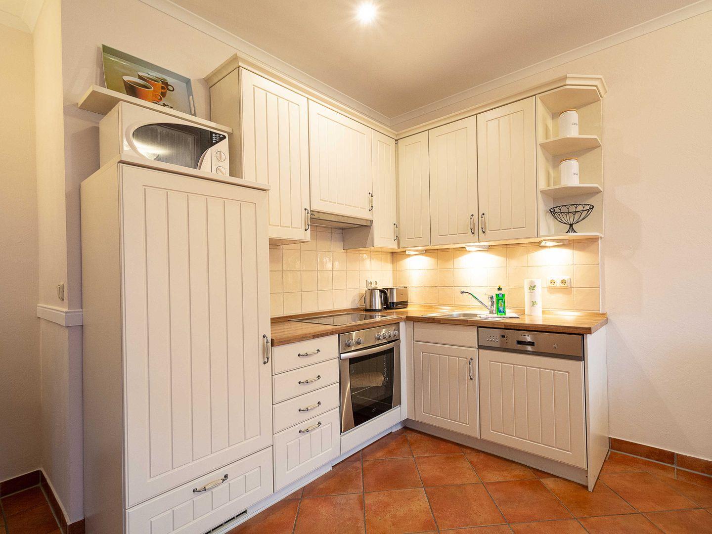 Die offene Küche beinhaltet eine voll ausgestattete Einbauküchenzeile mit 4-Zonen-Ceran-Kochfeld, Backofen, Dunstabzug, Mikrowelle, Kühlschrank mit Gefrierfach, Geschirrspülmaschine, Kaffeemaschine, Wasserkocher und Toaster. Die Küche ist mit Geschirr, Gläsern, Besteck und Töpfen komplett ausgestattet.