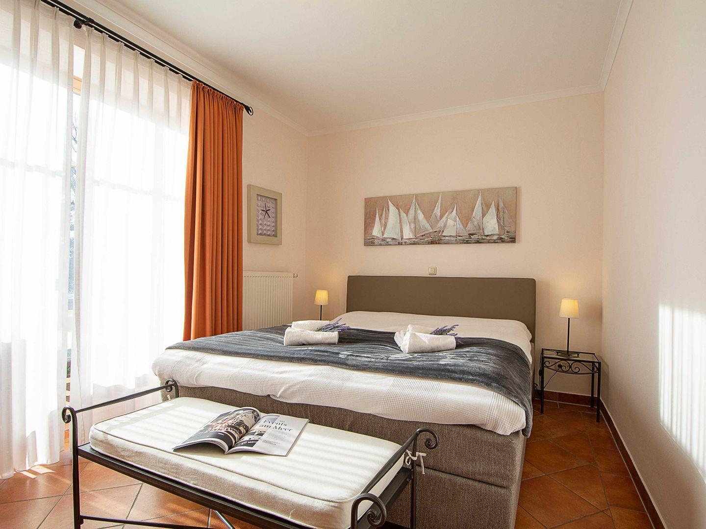 Das freundliche und geräumige Schlafzimmer ist mit einem bequemen Boxspring-Doppelbett (180 cm x 200 cm), Nachttischen mit Nachttischlampen, einer Sitzbank, einem geräumigen Kleiderschrank sowie einer Kofferablage eingerichtet und hat einen direkten Zugang zum Balkon.