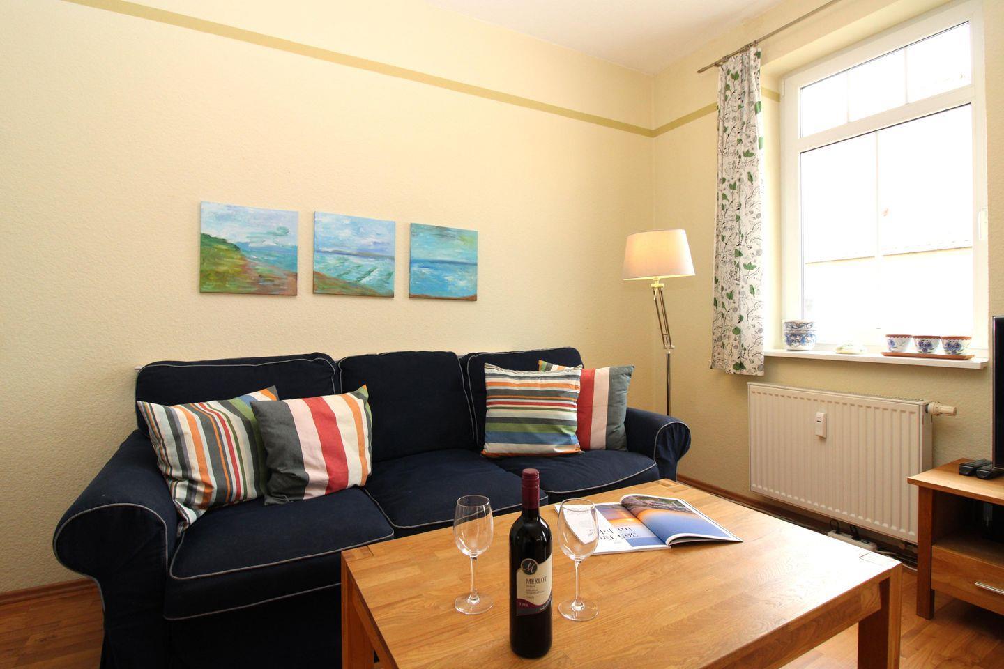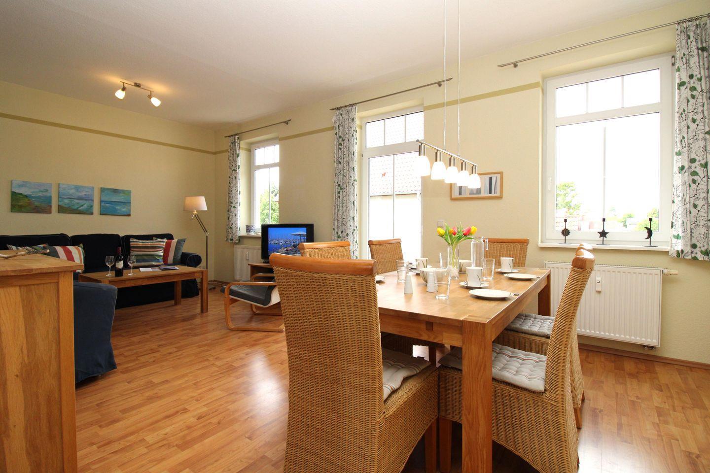 Das großzügige und gemütliche Wohn-/Esszimmer verfügt über eine separate Sitzgruppe mit einer bequemen (ausziehbaren Schlaf-)Couch, 2 Sesseln und Couchtisch, einen separaten Esstisch mit 6 Stühlen, ein Sideboard sowie eine Kommode. Vom Wohn-/Esszimmer aus haben Sie direkten Zugang zu einem kleinen Balkon (nach Süd-Westen ausgerichtet) mit 2 Stühlen und Balkontisch. Hier sitzen Sie entspannt und gemütlich mit Blick ins Grüne und können abends bei einem guten Glas Wein in Ruhe die lauen Sommernächte genießen!