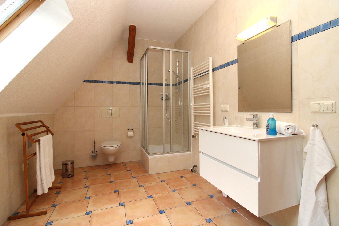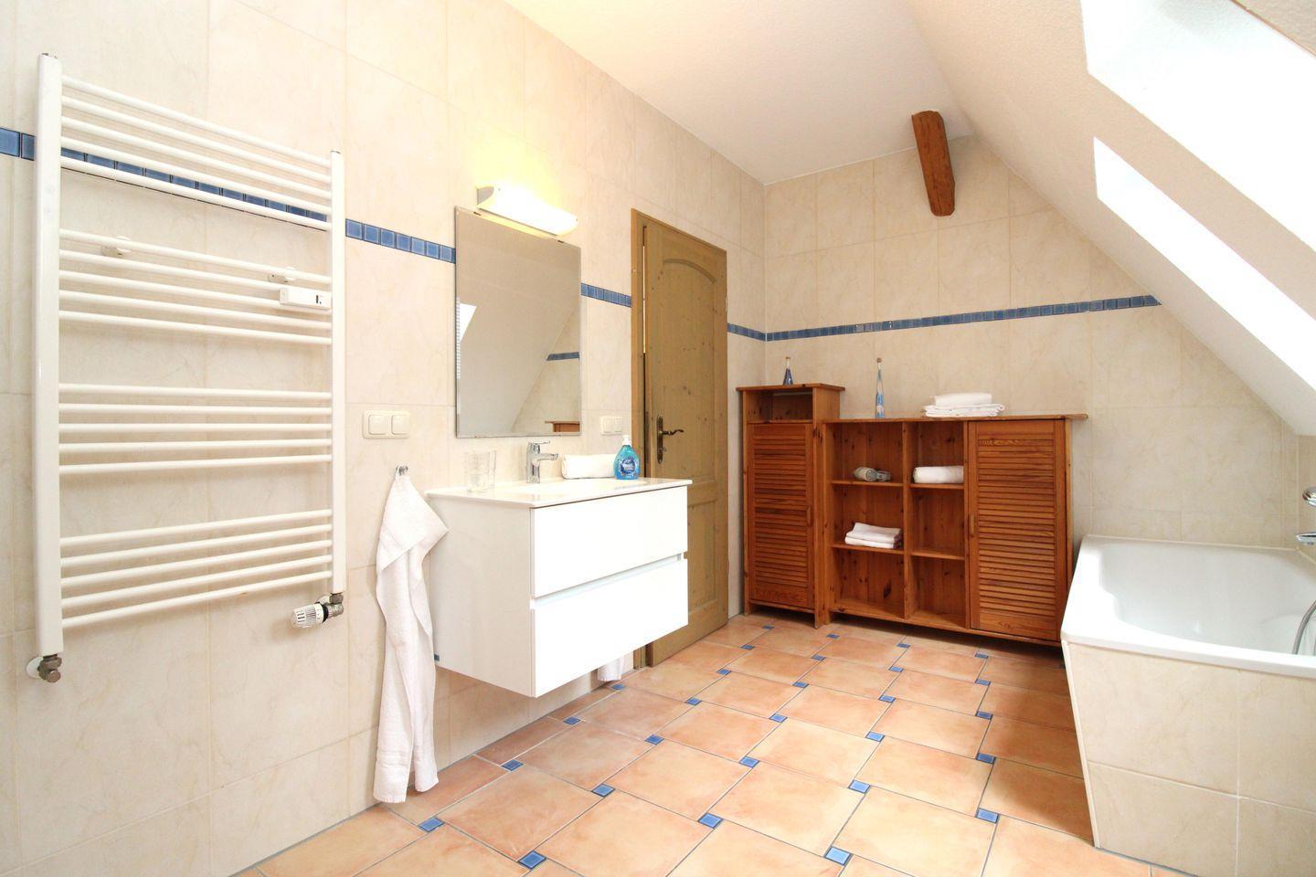 Das helle und geräumige Badezimmer (mit Tageslicht / Fenster) verfügt über eine Echtglas-Dusche sowie zusätzlich eine Badewanne, Waschbecken und WC, einen Handtuch-Heizkörper, einen Waschtisch-Unterschrank sowie verschiedene Regale und Schränke und bietet ausreichend Ablagemöglichkeiten.