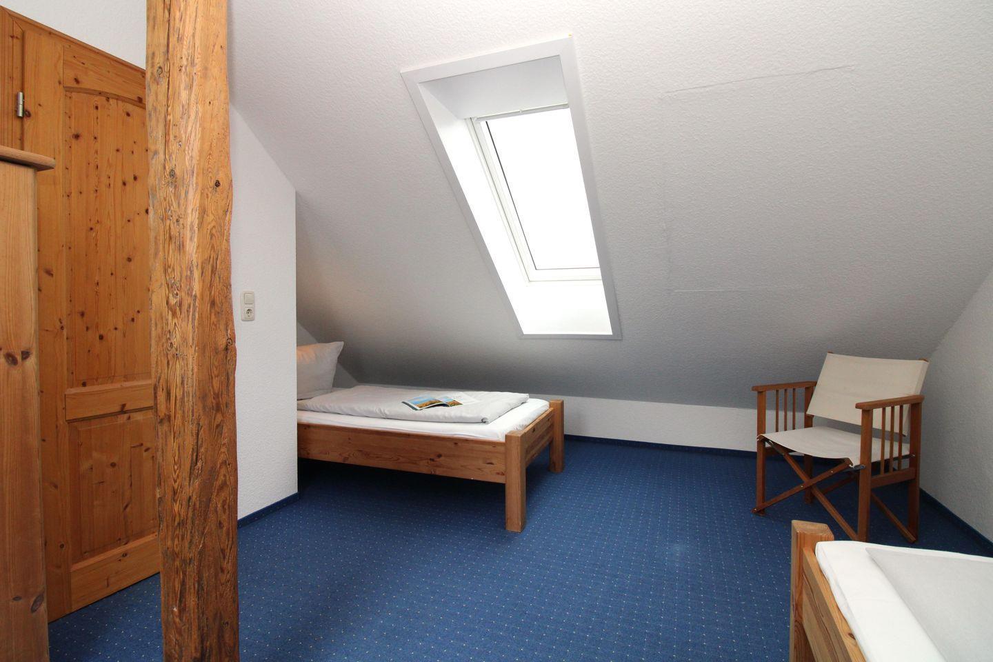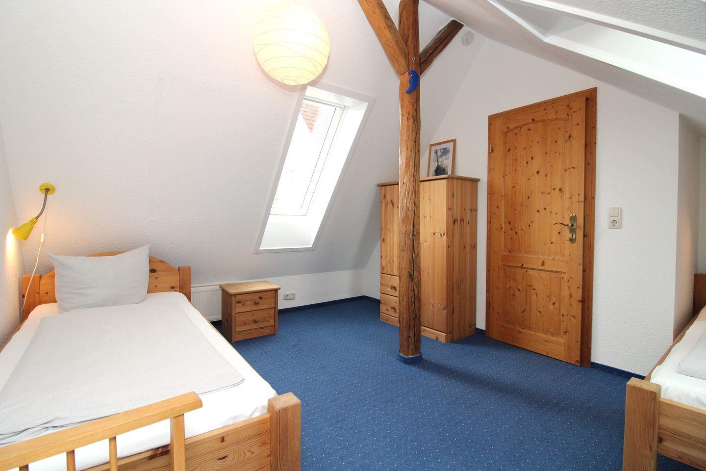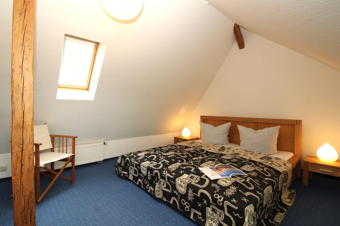 Das freundliche und geräumige 1. Schlafzimmer im Obergeschoss der Wohnung ist mit einem bequemen Doppelbett (2 x 90 cm x 200 cm), Nachttischen mit Nachttischleuchten, einem Kleiderschrank, einer Kommode sowie 2 Stühlen eingerichtet.
