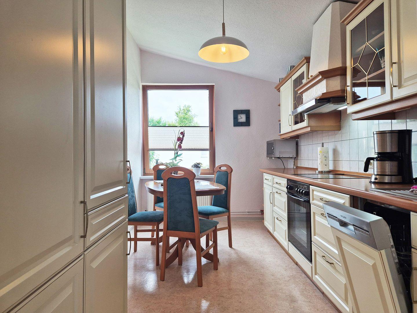 Die geschlossene Küche ist großzügig geschnitten und lädt mit einem Esstisch zum gemeinsamen Speisen ein. Sie ist vollständig eingerichtet und entspricht hohen Ansprüchen: Neben einem Cerankochfeld stehen Backofen, Mikrowelle, Kühlschrank, Spülmaschine, Wasserkocher, Toaster, Kaffeemaschine und ein extra Gefrierschrank zur Verfügung. Sämtliche Küchenutensilien, Geschirr und Besteck sowie Geschirrhandtücher werden gestellt, sodass einer komfortablen Selbstversorgung nichts im Wege steht.