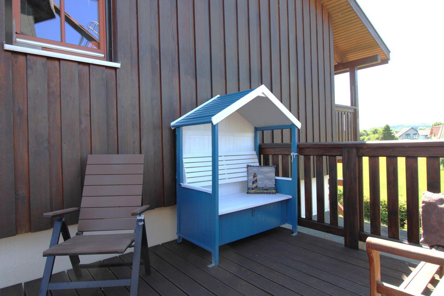 Das freundliche und sehr gemütliche Wohn-/Esszimmer (im Untergeschoss) verfügt über eine separate Sitzgruppe mit 2 bequemen Couchen, Sessel und Couchtisch, einen separaten Esstisch mit 4 Stühlen sowie verschiedene Kommoden. Vom Wohnzimmer aus haben Sie direkten Zugang zu der ca. 30 m² großen und sonnigen Dachterrasse mit Terrassenmöbeln und verschiedenen Sitzbänken. Hier sitzen Sie entspannt und gemütlich im Grünen und können abends bei einem guten Glas Wein in Ruhe die lauen Sommernächte genießen!