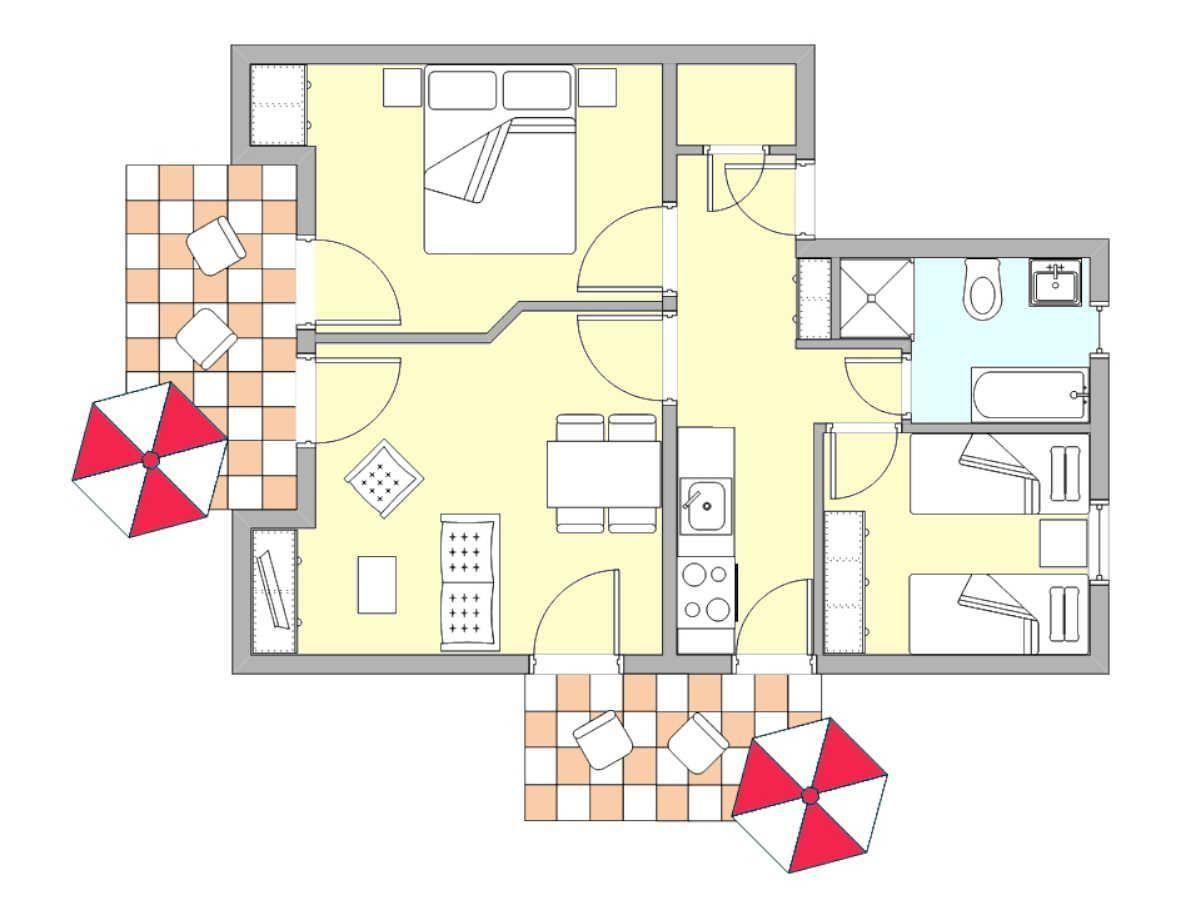 Gemütliche 3-Zimmer-Ferienwohnung (74?m²) für bis zu 4 Personen – mit Wohnbereich, TV, gut ausgestatteter Küchenzeile, 2 Schlafzimmern (1x Doppelbett, 1x zwei Einzelbetten) sowie Badezimmer mit Dusche, Badewanne, WC und Fenster. Zwei möblierte Terrassen bieten viel Raum zum Entspannen im Freien.