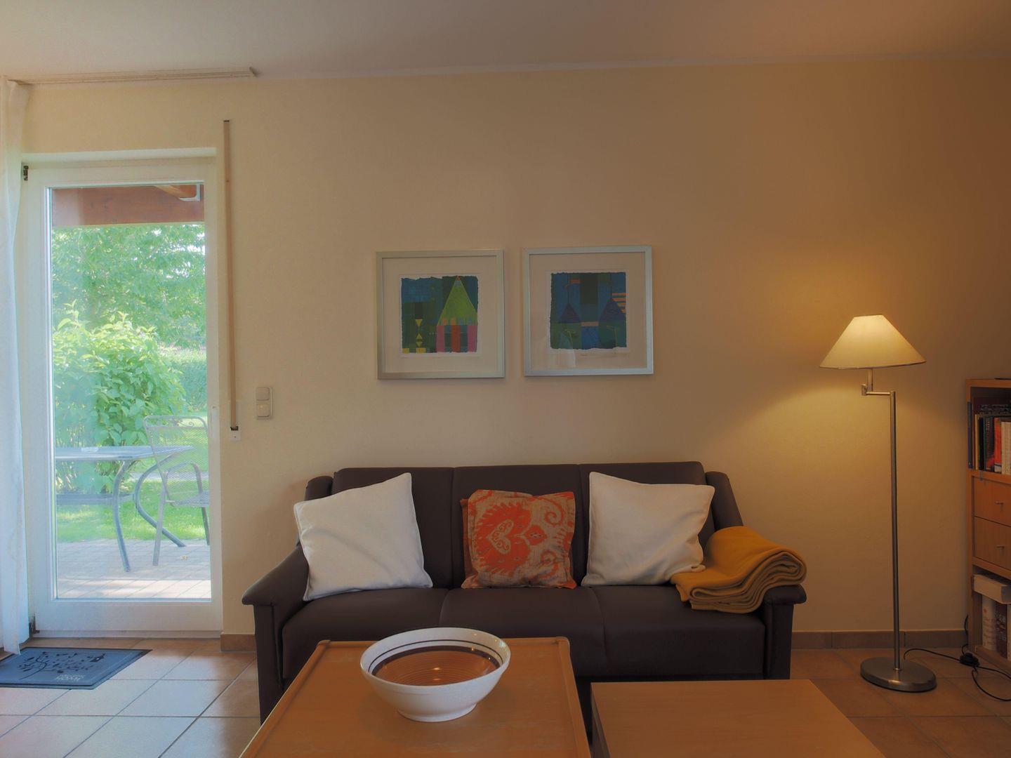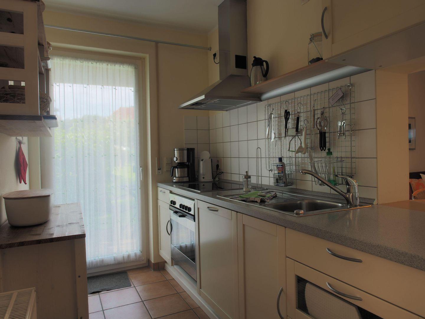Der helle Wohnbereich lädt mit gemütlicher Sitzecke und TV zum Entspannen ein. Die gut ausgestattete Küchenzeile mit Herd, Kaffeemaschine und allem, was man braucht, macht gemeinsames Kochen zum Vergnügen.