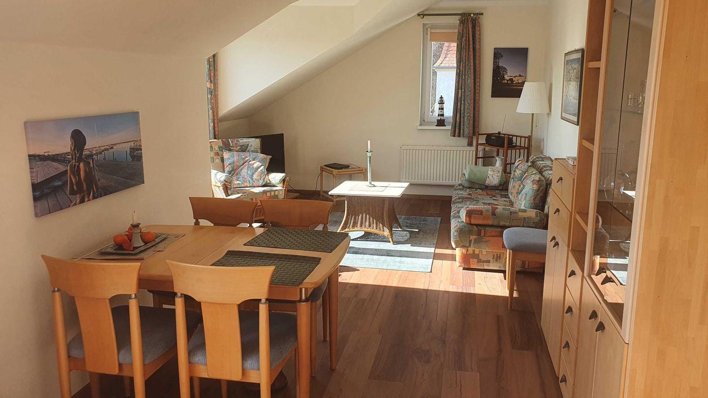 Die Ferienwohnung verfügt über zwei Zimmer: Ein separates Schlafzimmer mit bequemen Schlafmöglichkeiten und ein stilvoll eingerichtetes Wohnzimmer mit ausziehbarem Sofa. Insgesamt bieten vier Schlafplätze ausreichend Komfort. Für angenehme Nächte sorgen neben der Bettwäsche auch ein Sichtschutz für alle Fenster und die Zentralheizung.