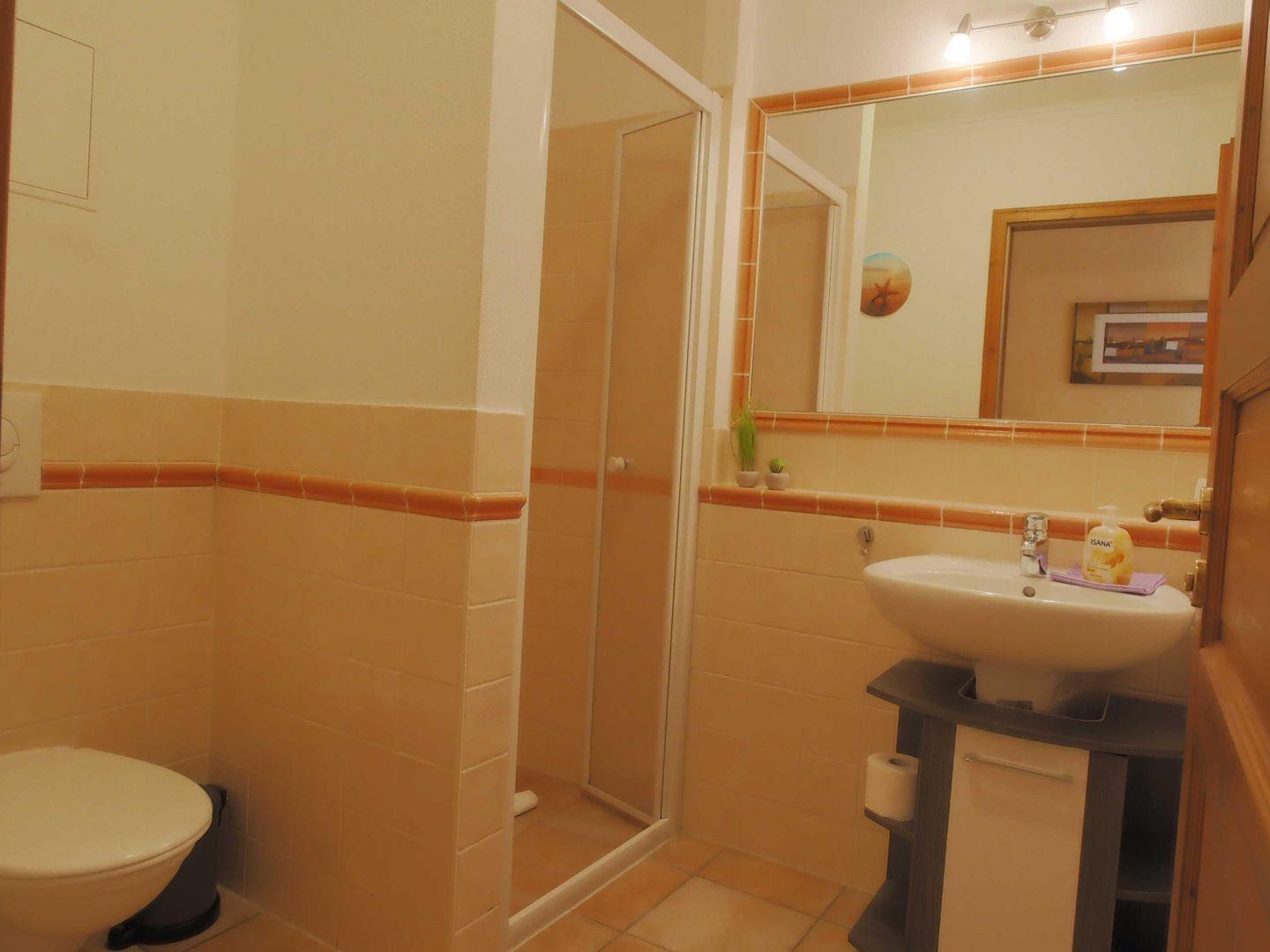 Das moderne Badezimmer verfügt über eine Dusche, Waschtisch und WC – hell, stilvoll und funktional.