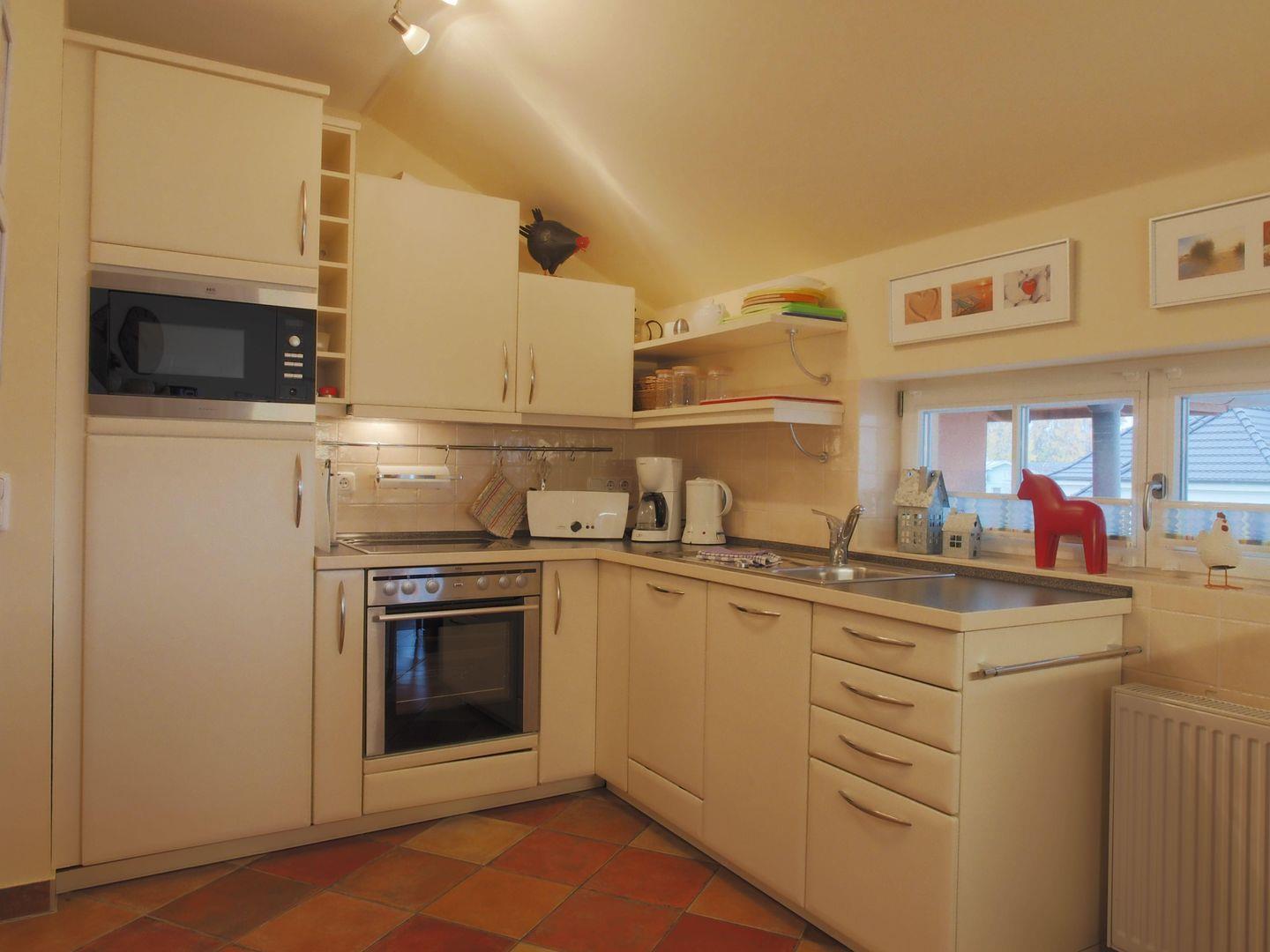 Die offene, aber geschickt abgetrennte Küche ist voll ausgestattet und lässt keine Wünsche offen. Sie ist durch den großen Esstisch optisch vom Wohnbereich getrennt, sodass ein großzügiger Wohn-Essbereich entsteht, der sowohl funktional als auch gemütlich ist. Mit Ceranfeld, Mikrowelle, Kühlschrank, Geschirrspüler, Kaffeemaschine, Toaster, Wasserkocher, Mixer, Eierkocher und komplettem Geschirr wird Kochen auch im Urlaub zum Vergnügen.
