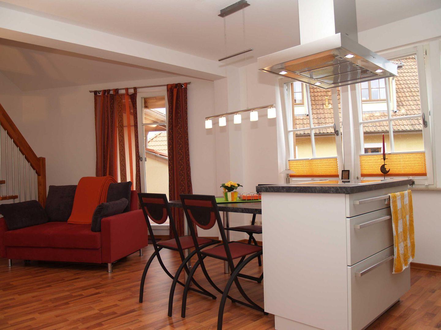 Die geschmackvolle Einrichtung, kombiniert mit einer außergewöhnlichen Raumaufteilung über zwei Ebenen, schafft ein einzigartiges Wohngefühl. Vom hellen Wohn- und Essbereich mit gemütlicher Sitzecke, TV und Esstisch führt eine elegante Wendeltreppe in das obere Stockwerk – direkt in das beeindruckende „Turmzimmer“, ein Schlafzimmer mit Doppelbett, ein weiteres Schlafzimmer mit zwei Einzelbetten und großem Kleiderschrank. Von hier genießen Sie einen herrlichen Blick über das historische Ensemble des Kaiserlichen Postamts.
