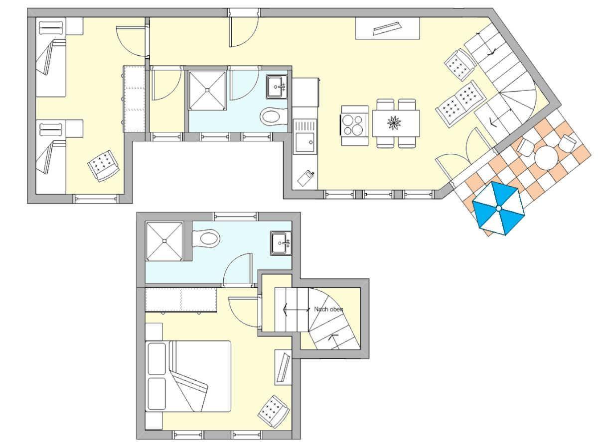 Dieses ca. 75 m² große Dachgeschoss-Appartement für 4 Personen (Hunde willkommen) begeistert mit seiner besonderen Raumaufteilung und geschmackvollen Einrichtung. Über eine Wendeltreppe erreichen Sie das einzigartige „Turmzimmer“ mit Doppelbett, TV und herrlichem Ausblick. Zwei moderne Bäder, ein offener Wohn- und Essbereich mit voll ausgestatteter Küche sowie ein Schlafsofa bieten Komfort und Gemütlichkeit auf höchstem Niveau.