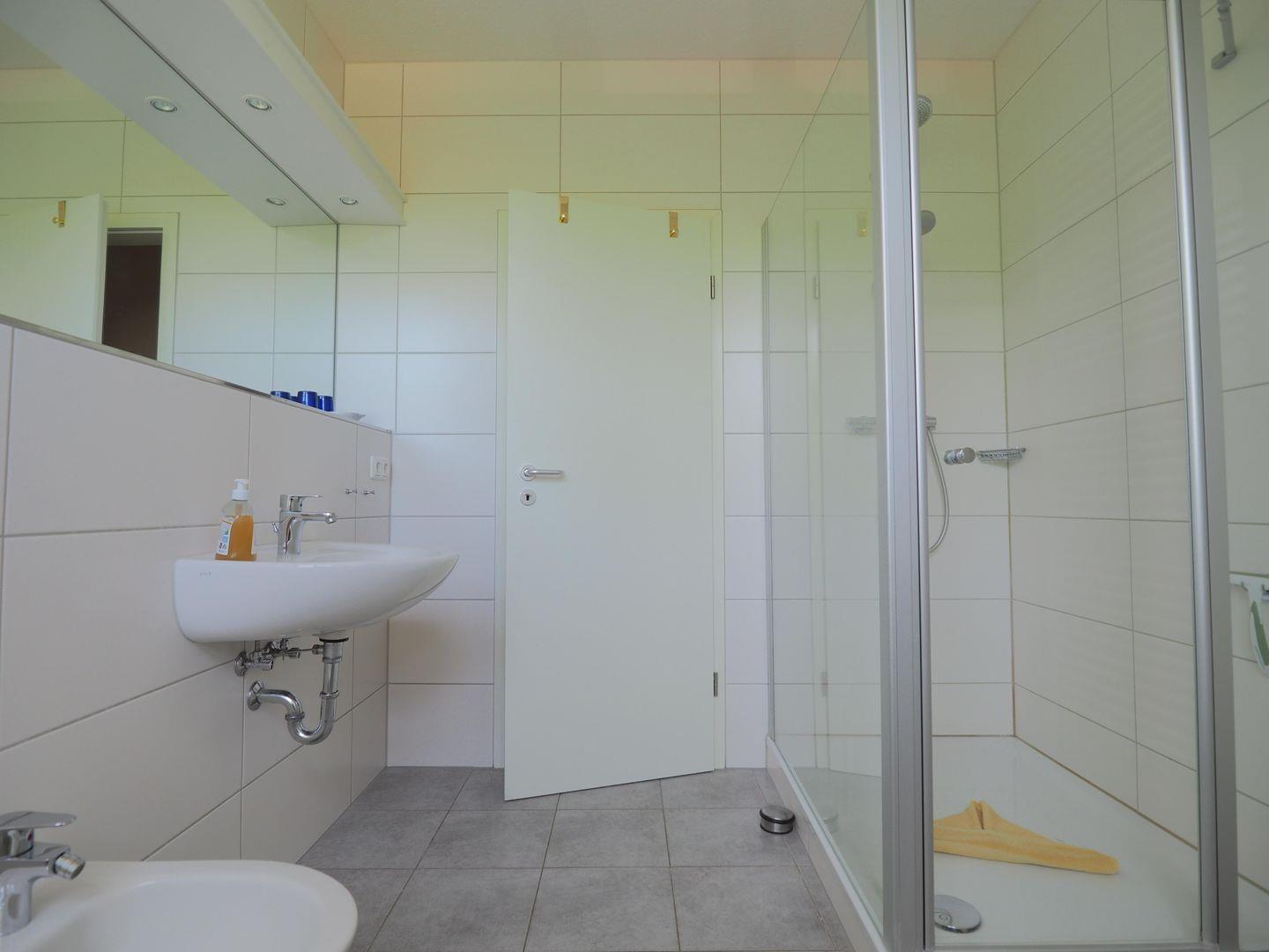 Das Schlafzimmer mit Doppelbett und großem Kleiderschrank garantiert erholsame Nächte. Das moderne Badezimmer ist mit großer Dusche, WC, Kosmetikspiegel und Föhn ausgestattet – alles, was Sie für einen komfortablen Aufenthalt benötigen.