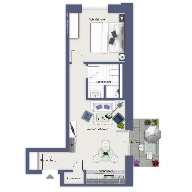 Die strandnahe 2-Zimmer-Wohnung (ca. 41 m²) im Erdgeschoss bietet einen funktionalen Grundriss und ist komplett eingerichtet. Alle Fußböden der Wohnung sind mit wohnlichen terracottafarbenen Fliesen versehen.