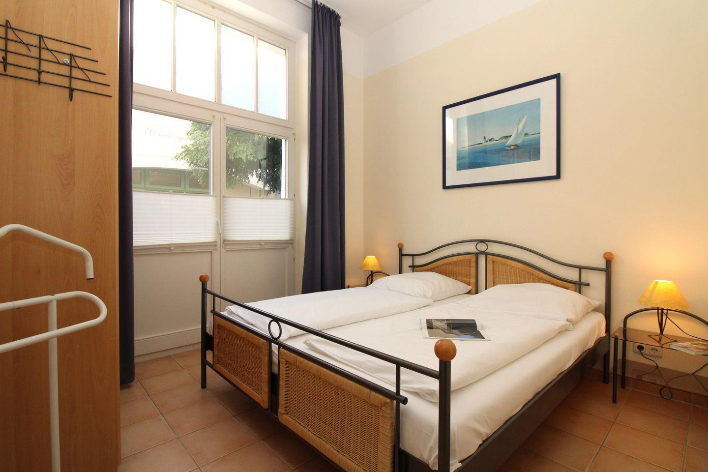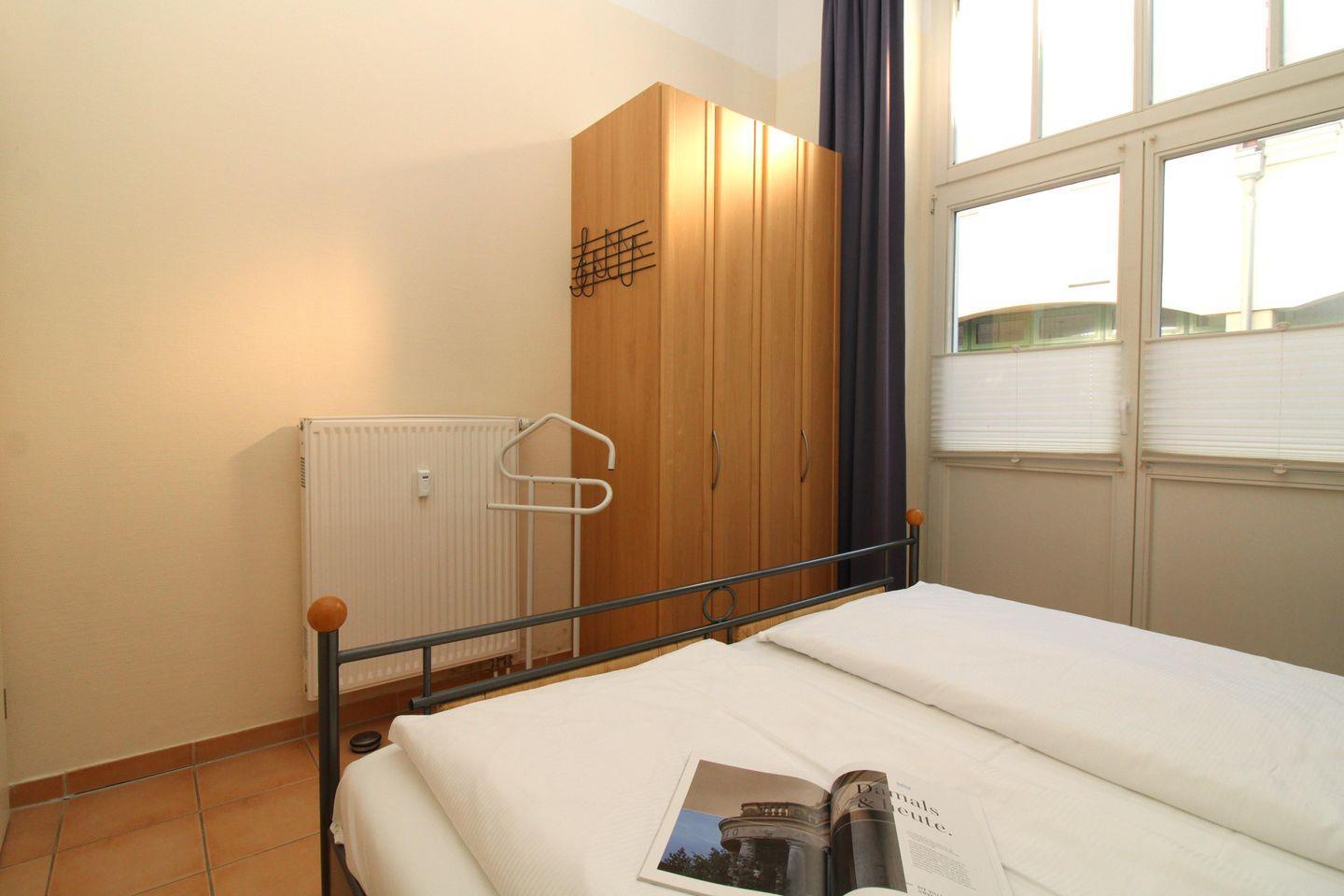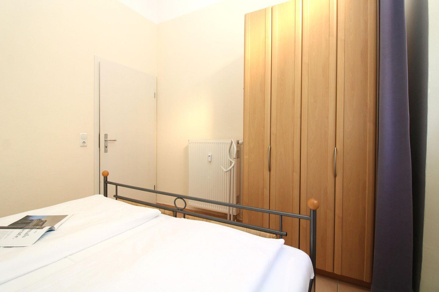 Das freundliche Schlafzimmer ist mit einem bequemen Doppelbett (2 x 90 cm x 200 cm), Nachttischen mit Nachttischlampen, einem geräumigen Kleiderschrank sowie einem Kleiderständer eingerichtet.