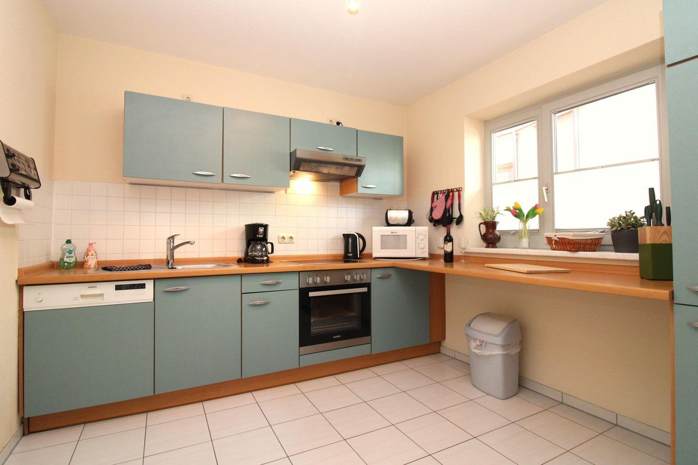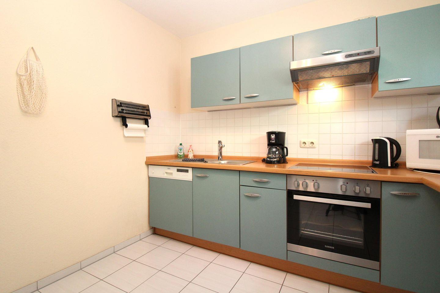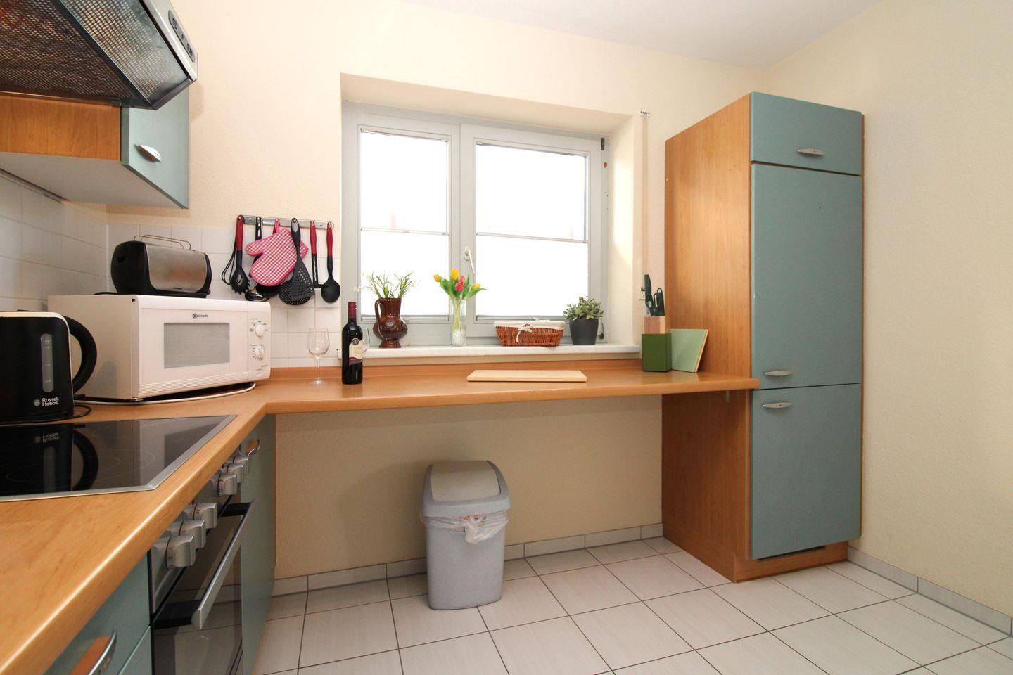 Die separate Küche beinhaltet eine moderne und voll ausgestattete Einbauküchenzeile mit 4-Zonen-Ceran-Kochfeld, Backofen, Dunstabzug, Mikrowelle, Kühlschrank mit Gefrierfach, Geschirrspülmaschine, Kaffeemaschine, Wasserkocher und Toaster. Die Küche ist mit Geschirr, Gläsern, Besteck und Töpfen komplett ausgestattet.