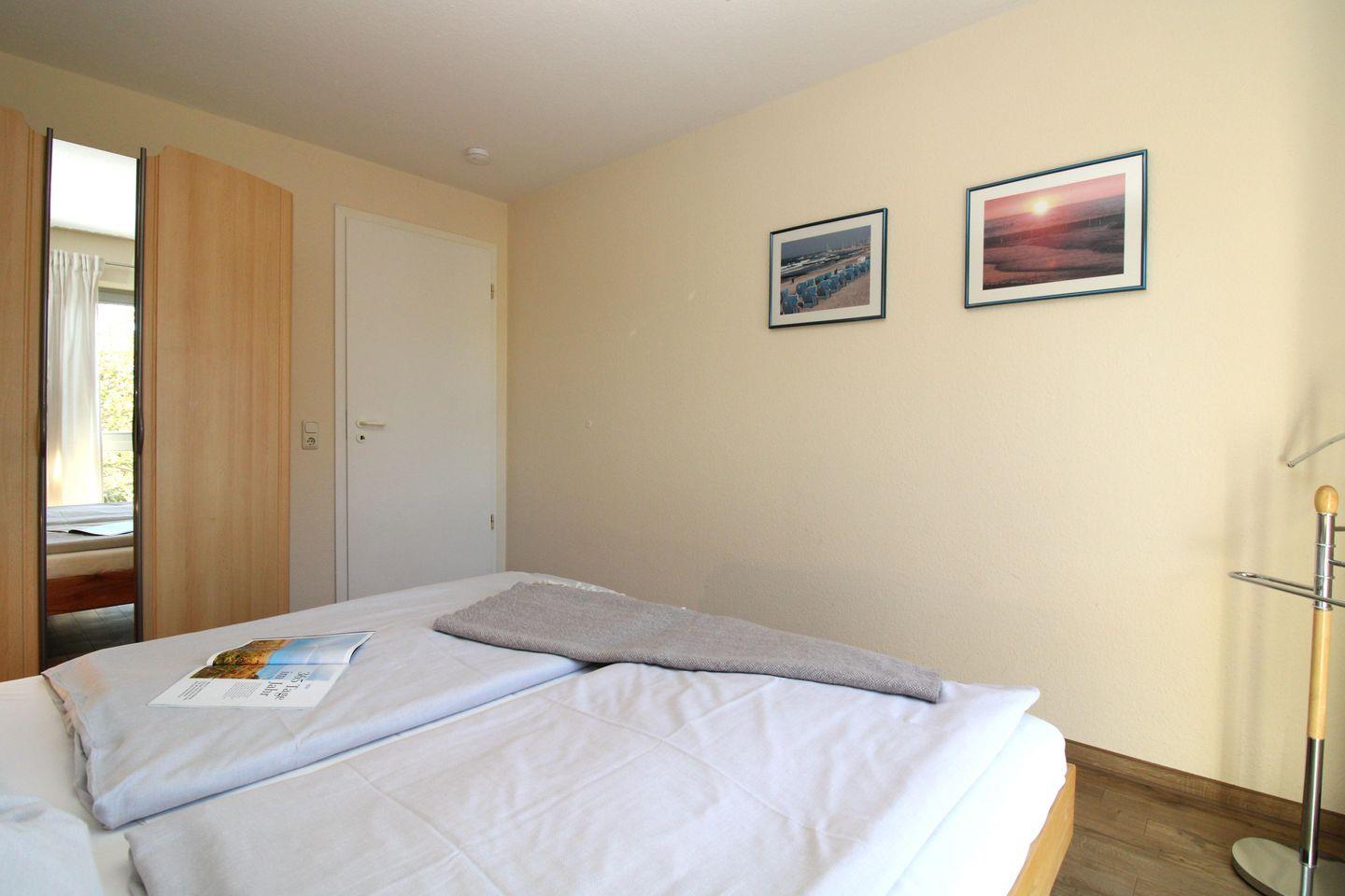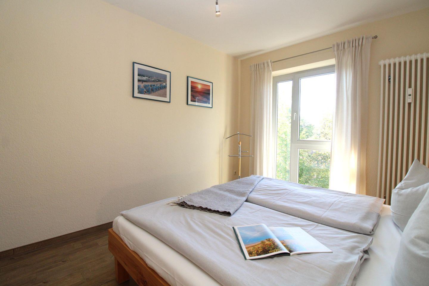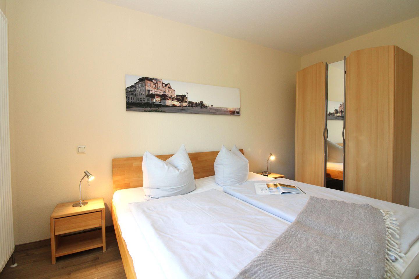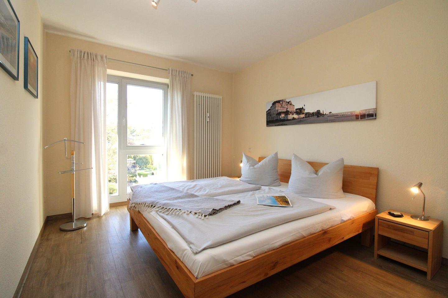 Das helle und geräumige Schlafzimmer ist mit einem bequemen Doppelbett (2 x 90 cm x 200 cm), Nachttischen mit Nachttischlampen und einem Kleiderschrank eingerichtet.