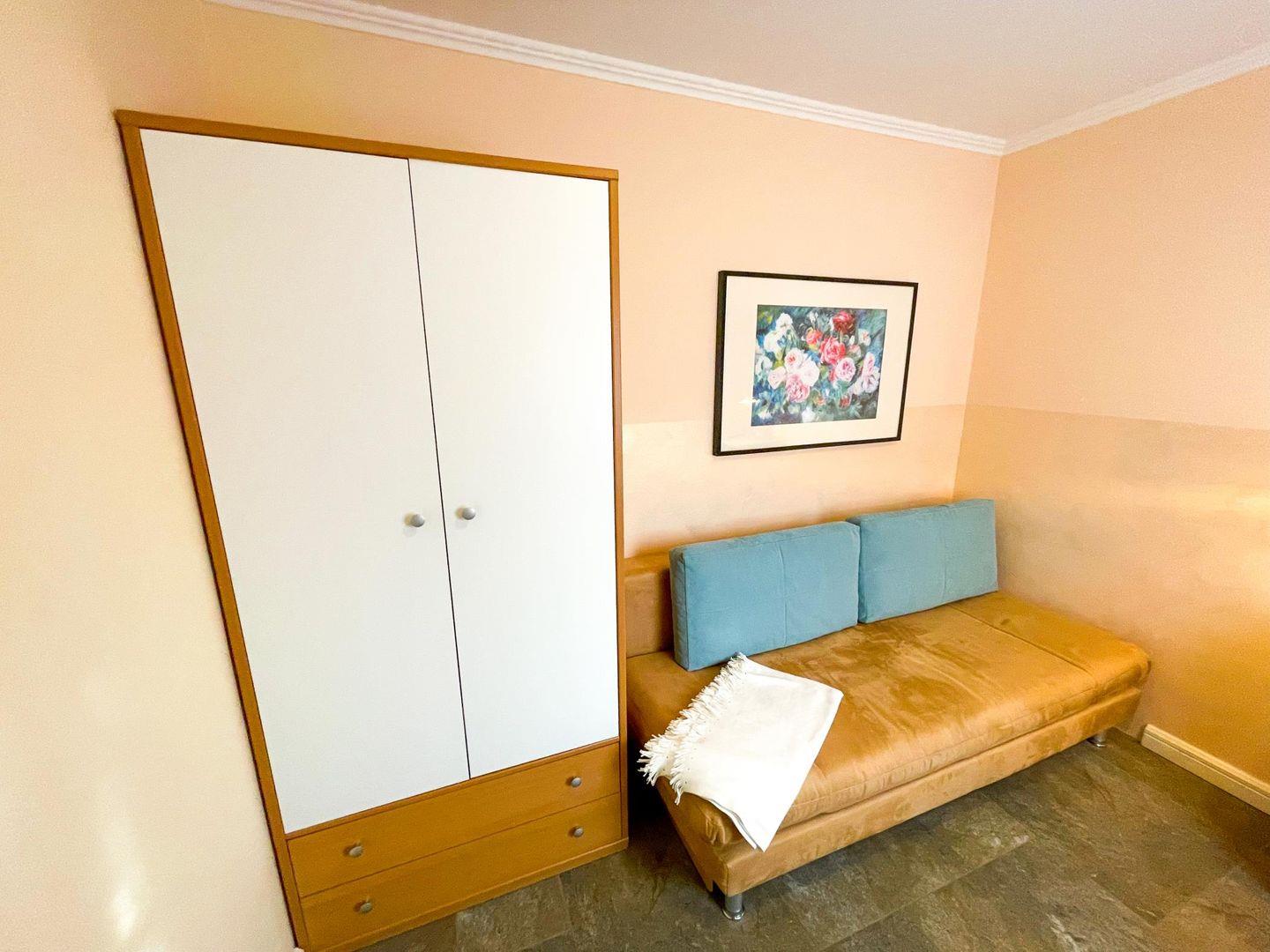 Im größeren der beiden Schlafräume freut sich der Gast über das komfortable Doppelbett mit zwei getrennten Matratzen und hoher Einstiegshöhe. Der kleinere Schlafraum dient tagsüber auch als Rückzugsort: ausgestattet mit einer kleinen Bibliothek und einem zweiten Flachbild-TV ist hier gute Unterhaltung garantiert. Für die Nacht kann die bequeme Couch zum Bett umgebaut werden.