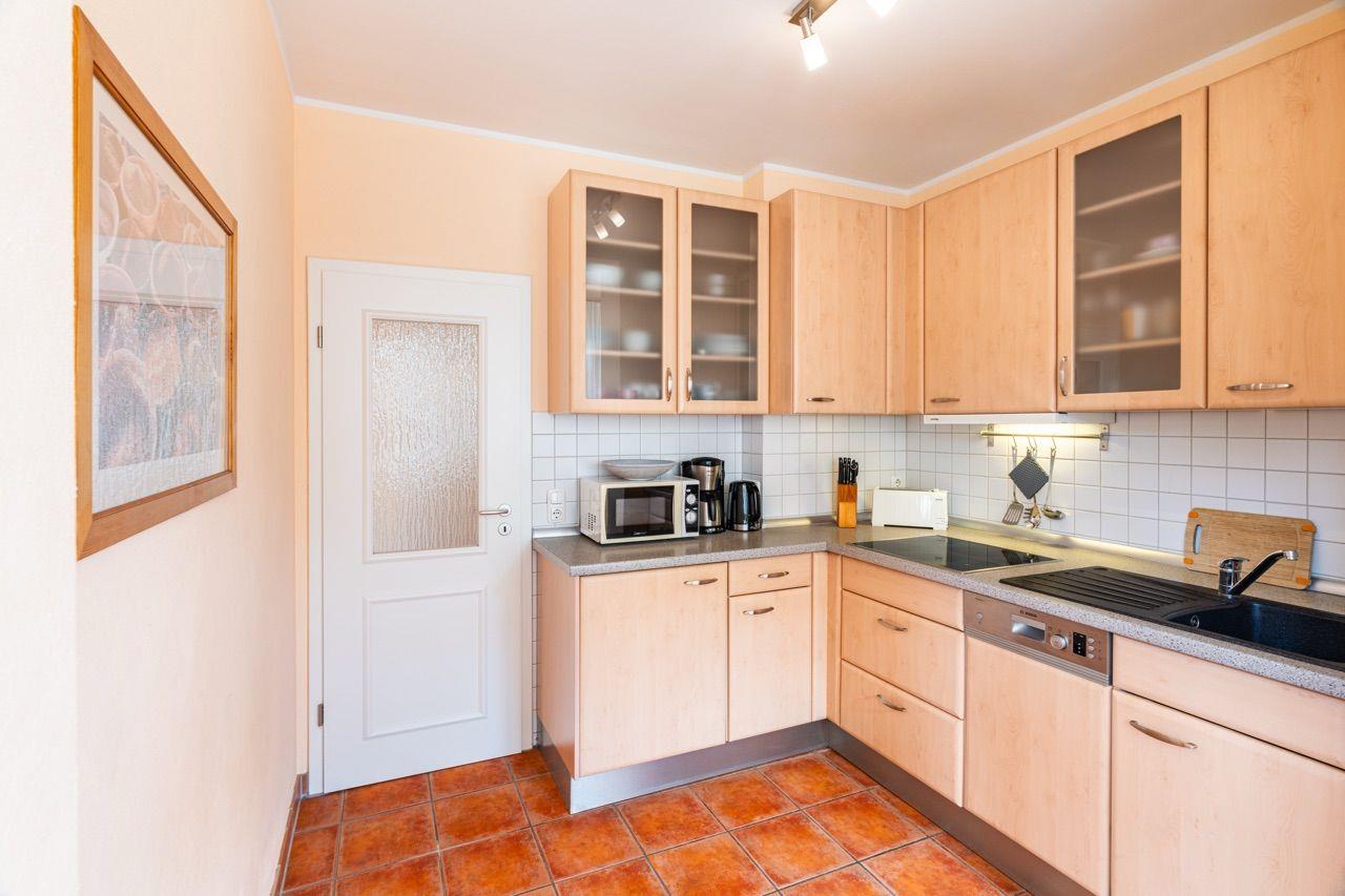 Der Wohnbereich ist optisch von der Küche getrennt und lässt sich somit auch hervorragend als zweites Schlafzimmer nutzen. Echtholzmöbel, hochwertige Sitzgelegenheiten aus Leder sowie modernste TV-Technik laden zum Verweilen ein. Die Küche ist komplett ausgestattet und lässt kaum einen Wunsch offen.