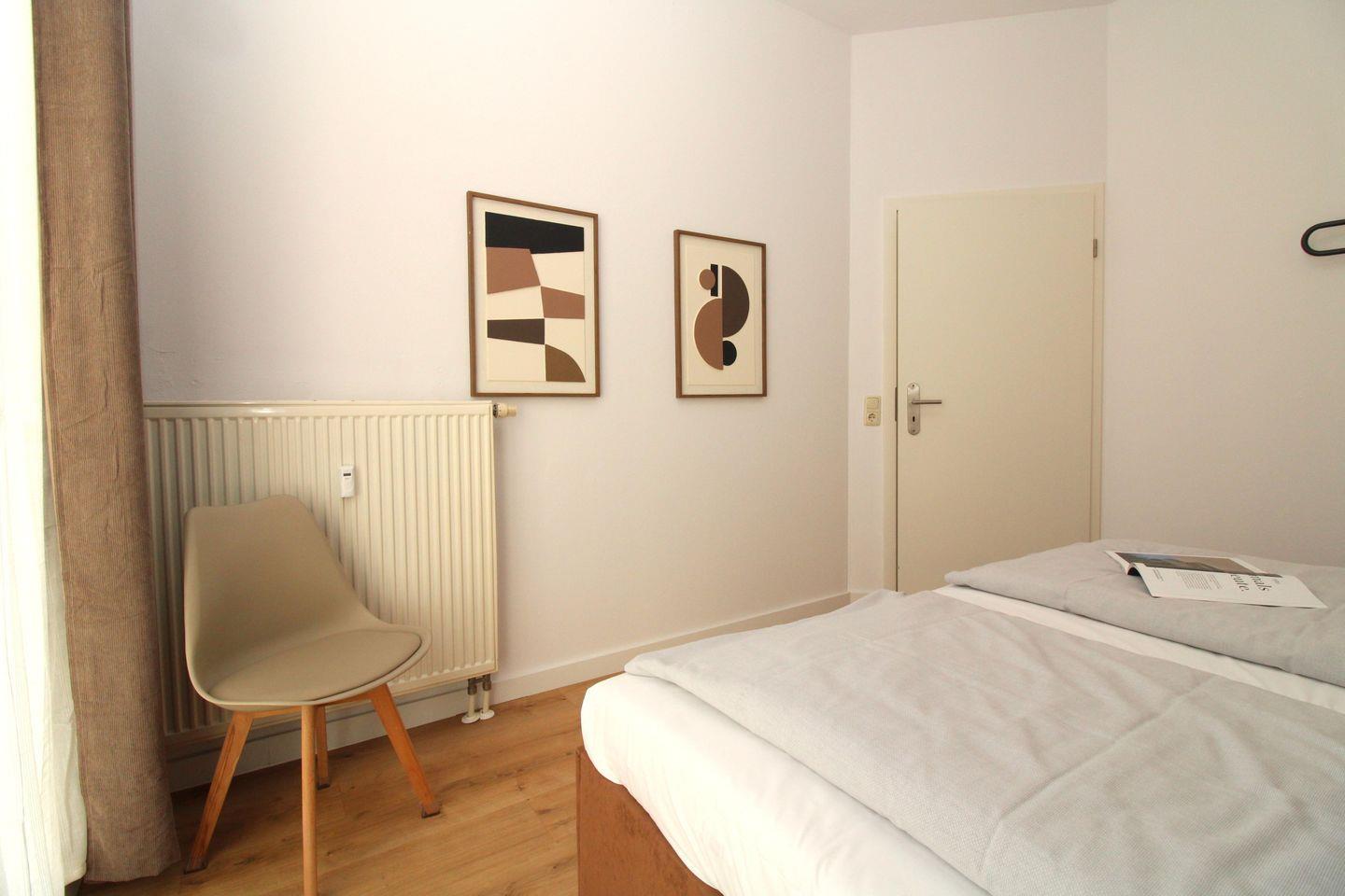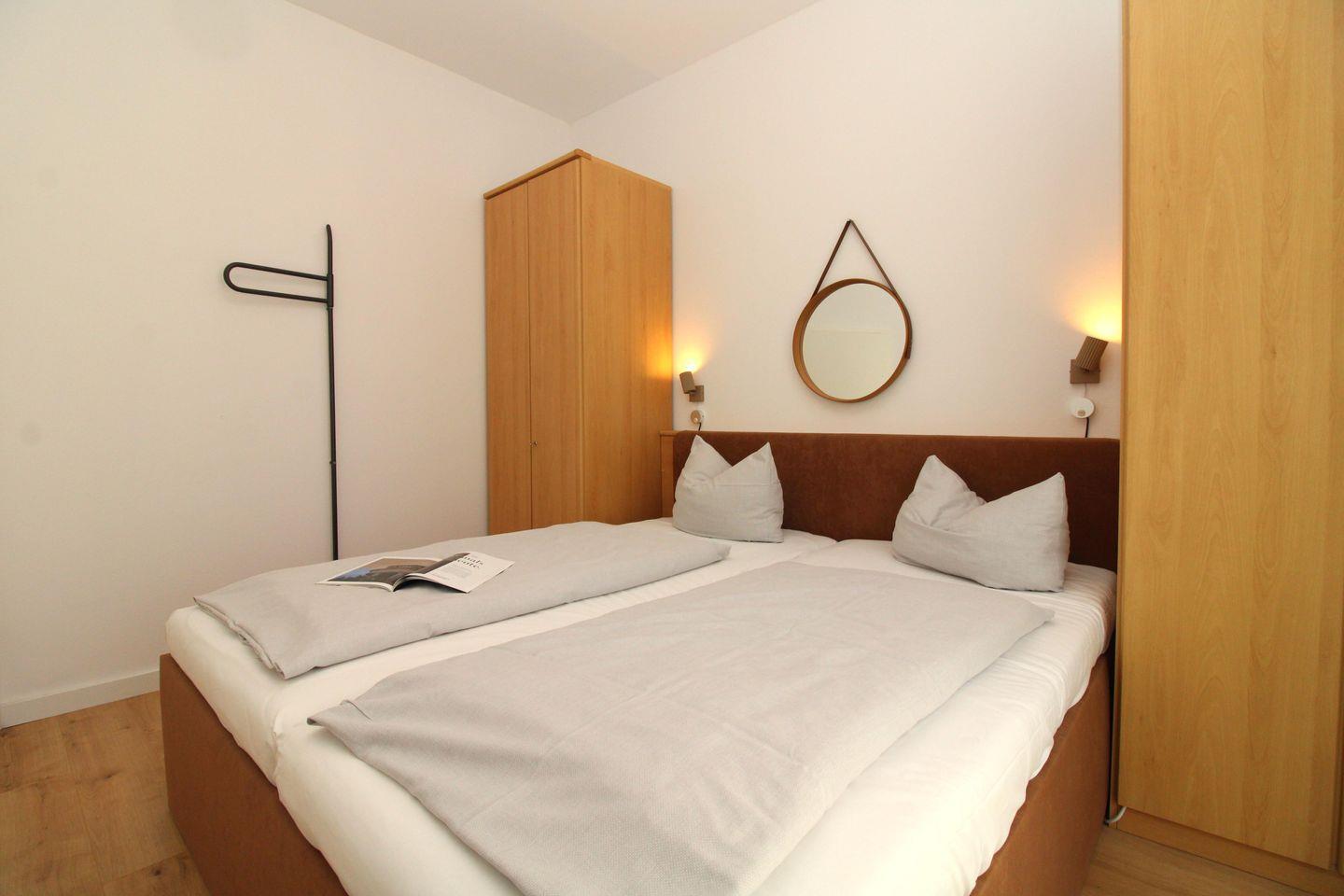 Das gemütliche 1. Schlafzimmer ist mit einem bequemen Doppelbett (2 x 90 cm x 200 cm), Nachttischlampen, 2 Kleiderschränken sowie einem Garderobenständer eingerichtet und hat einen direkten Zugang zum Gartenbereich.